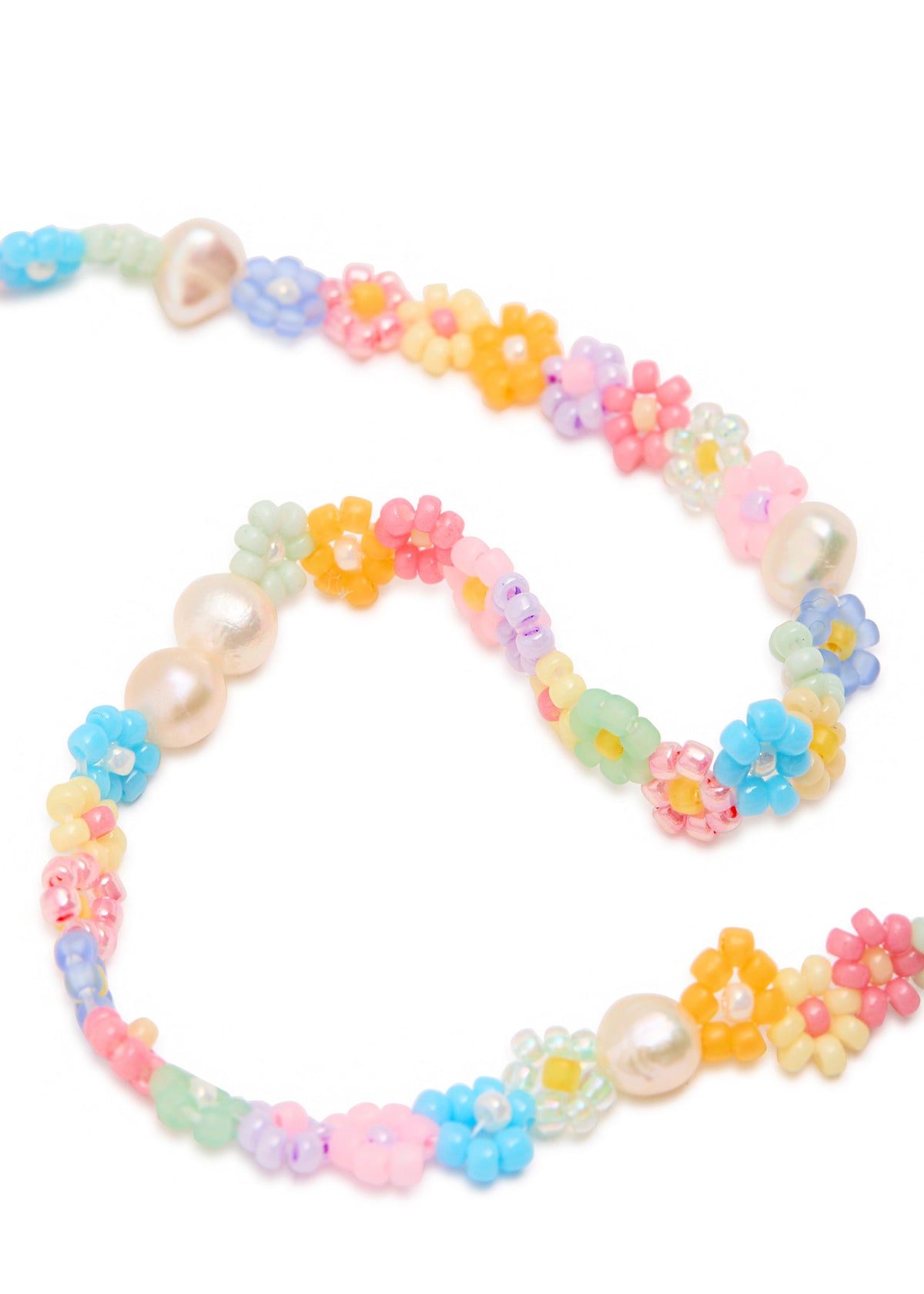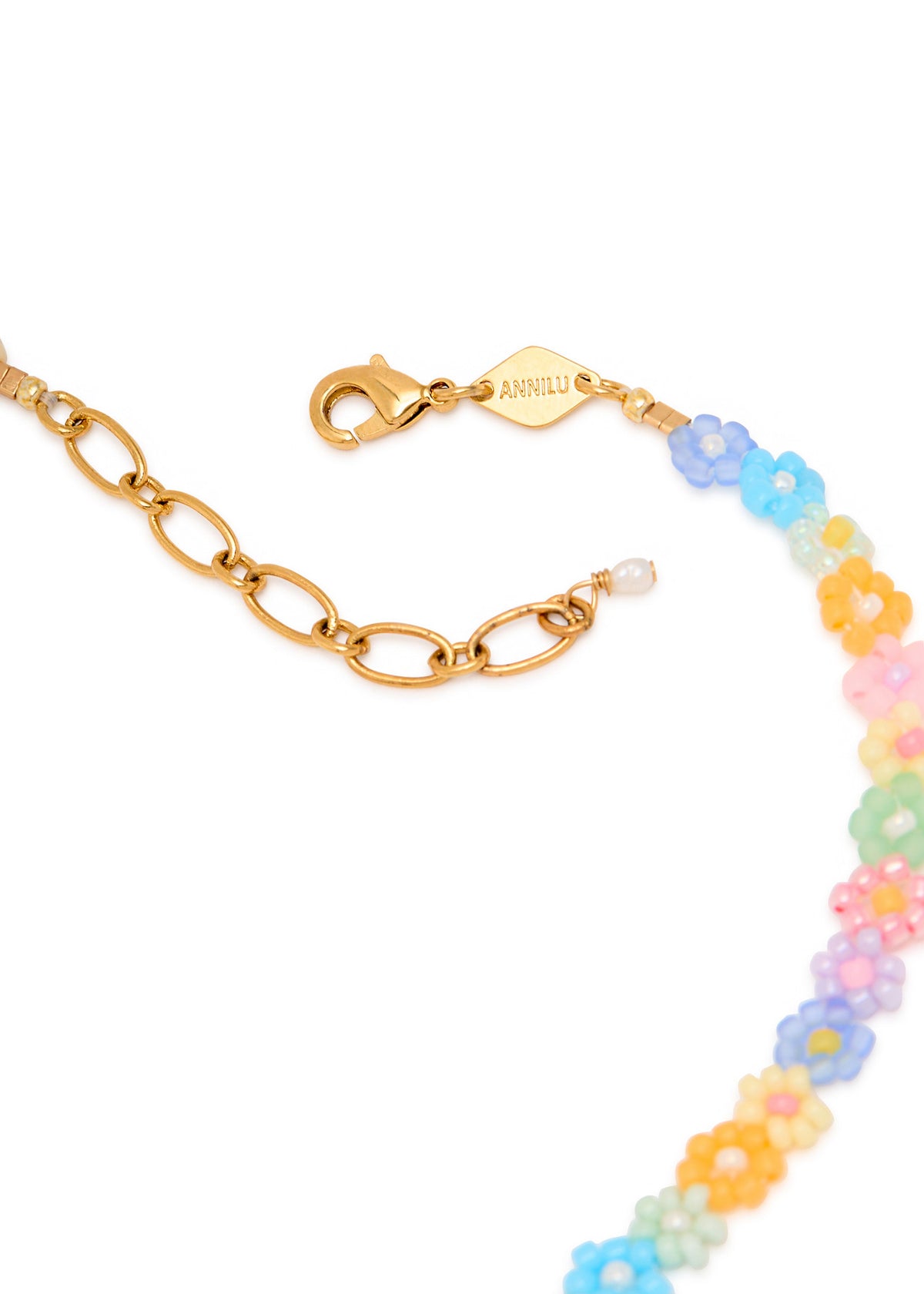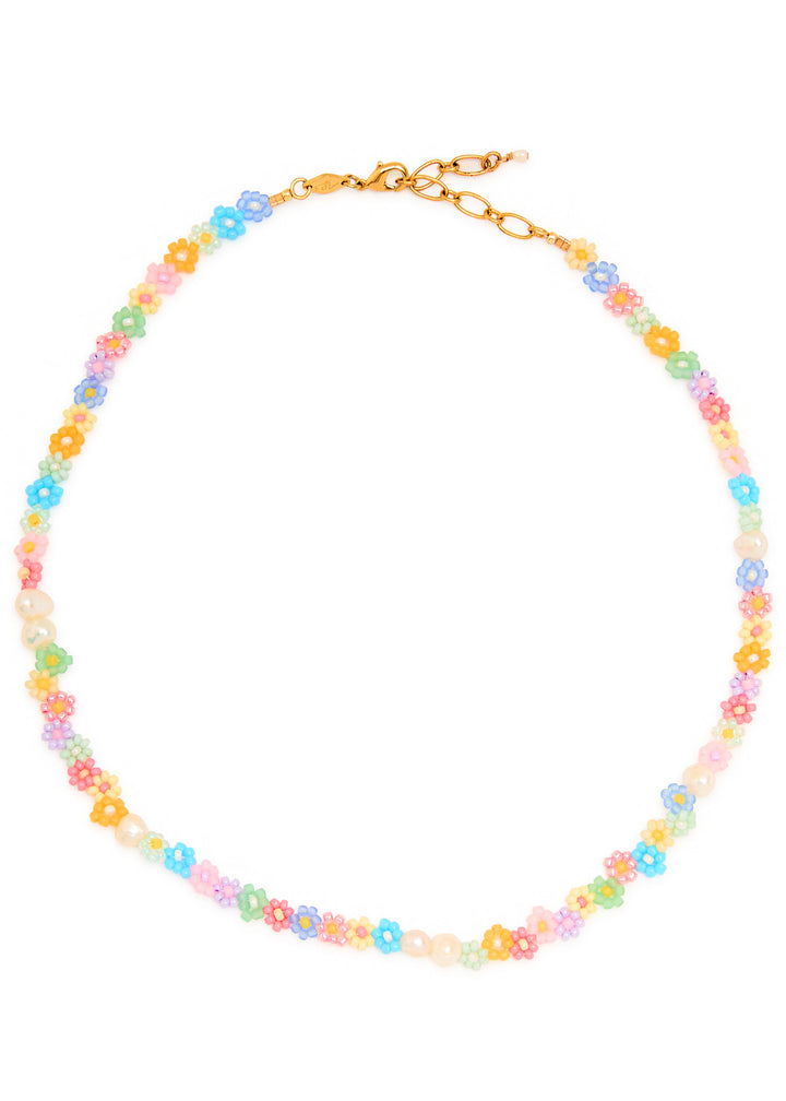 This necklace is handmade from 18kt gold-plated metal and features floral glass beads and freshwater pearl embellishments. It has an adjustable lobster-clasp fastening with a minimum length of 39.5cm and a maximum length of 44cm.