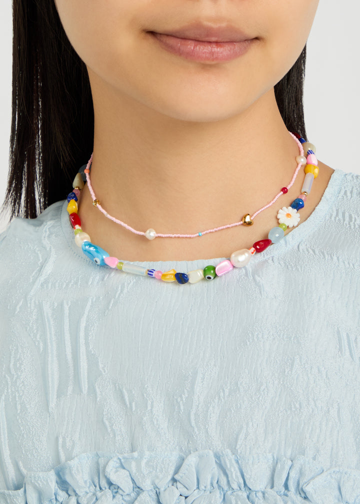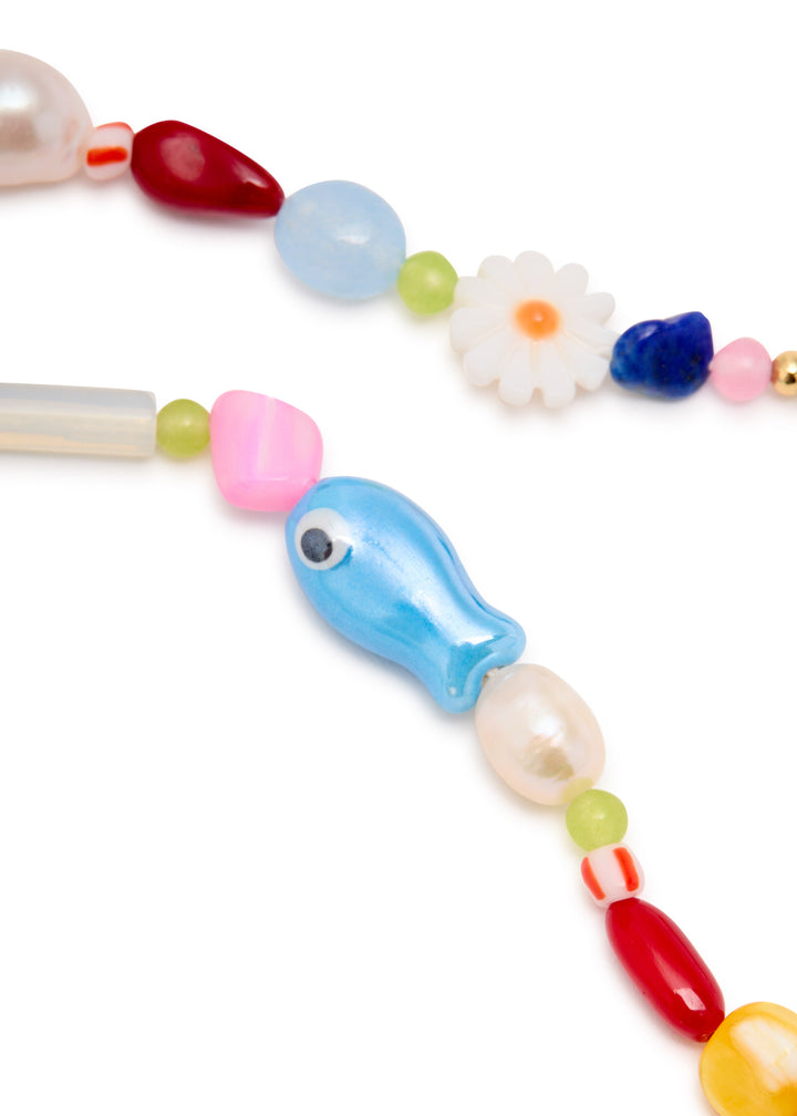 This Happy beaded 18kt gold-plated necklace by Anni Lu is a vibrant and joyful statement. The playful mix of glass beads, whimsical floral and fish beads, and luminous freshwater pearls creates a delightful and eclectic aesthetic. This necklace is a perfect expression of personality and happiness, ideal for adding a touch of carefree style to any look.