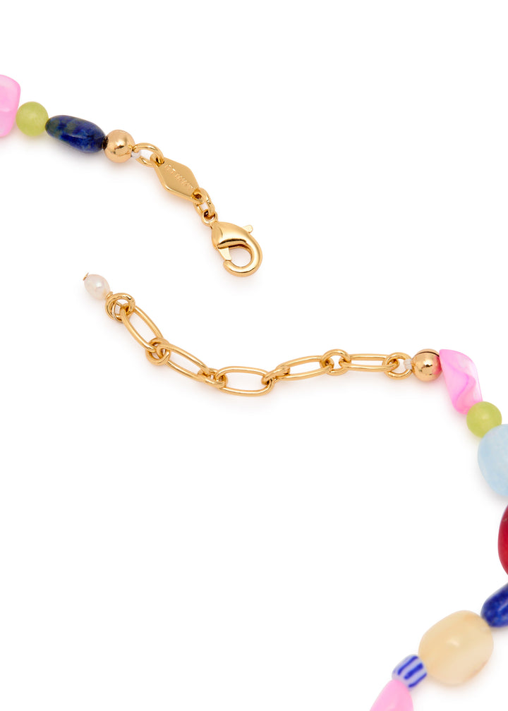 This necklace is handmade from 18kt gold-plated brass and features a variety of beads including glass, floral, fish, freshwater pearls, lazurite, and jade. It has an adjustable lobster-clasp fastening and a length of 42cm.