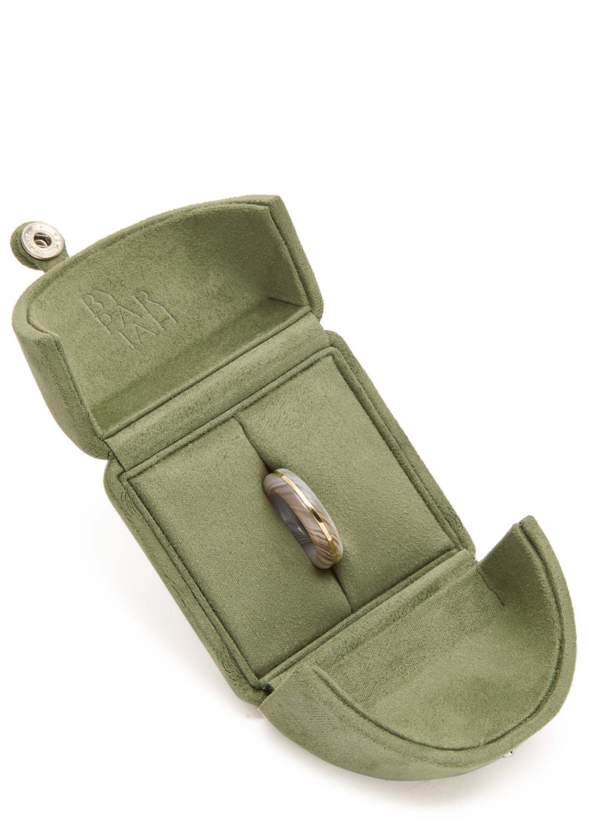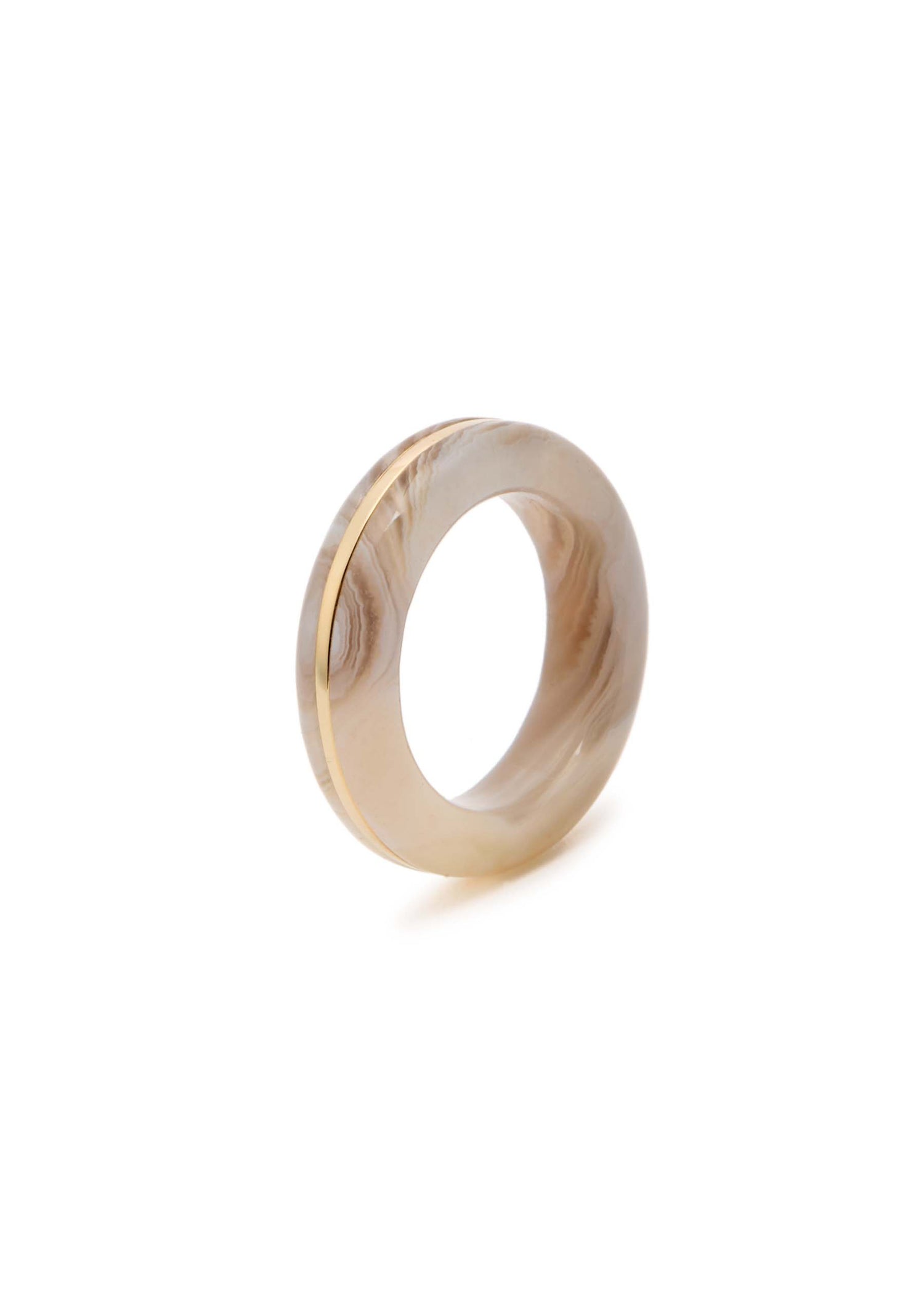 This handmade ring is crafted from agate with a 14kt gold insert. It has a width of 0.6cm.