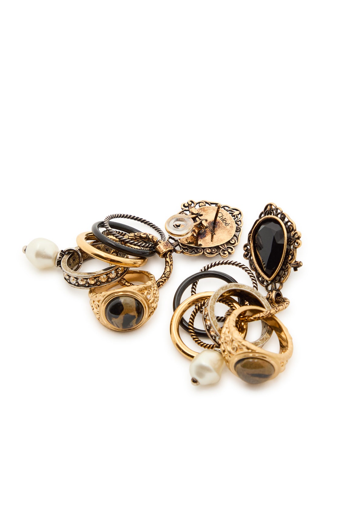 These The Chloé Antique Pearls embellished drop earrings by Chloé are a breathtaking fusion of classic elegance and modern artistry. The crystal-embellished stud and a unique mix of marble, faux pearl, and crystal-embellished ring pendants create a luxurious and eclectic silhouette. These earrings are a perfect statement for adding a touch of vintage-inspired glamour with a contemporary twist.