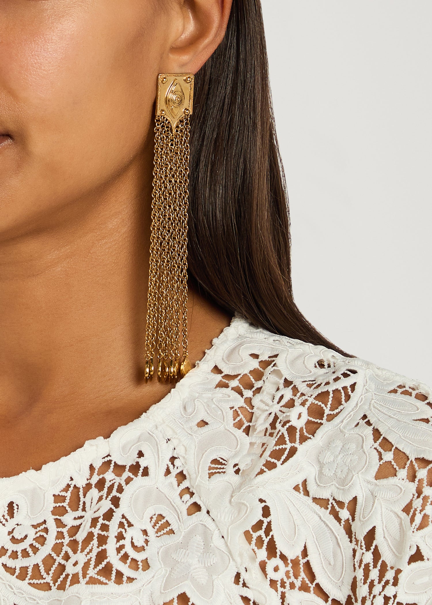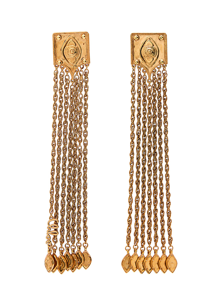 These The Chloé Amulet drop earrings by Chloé are a bold and dynamic statement. The engraved stud is complemented by a dramatic fringe of delicate chains and charming embellishments. These earrings are a powerful accessory, perfect for adding a touch of confident, high-fashion flair and a sense of effortless movement to your look.