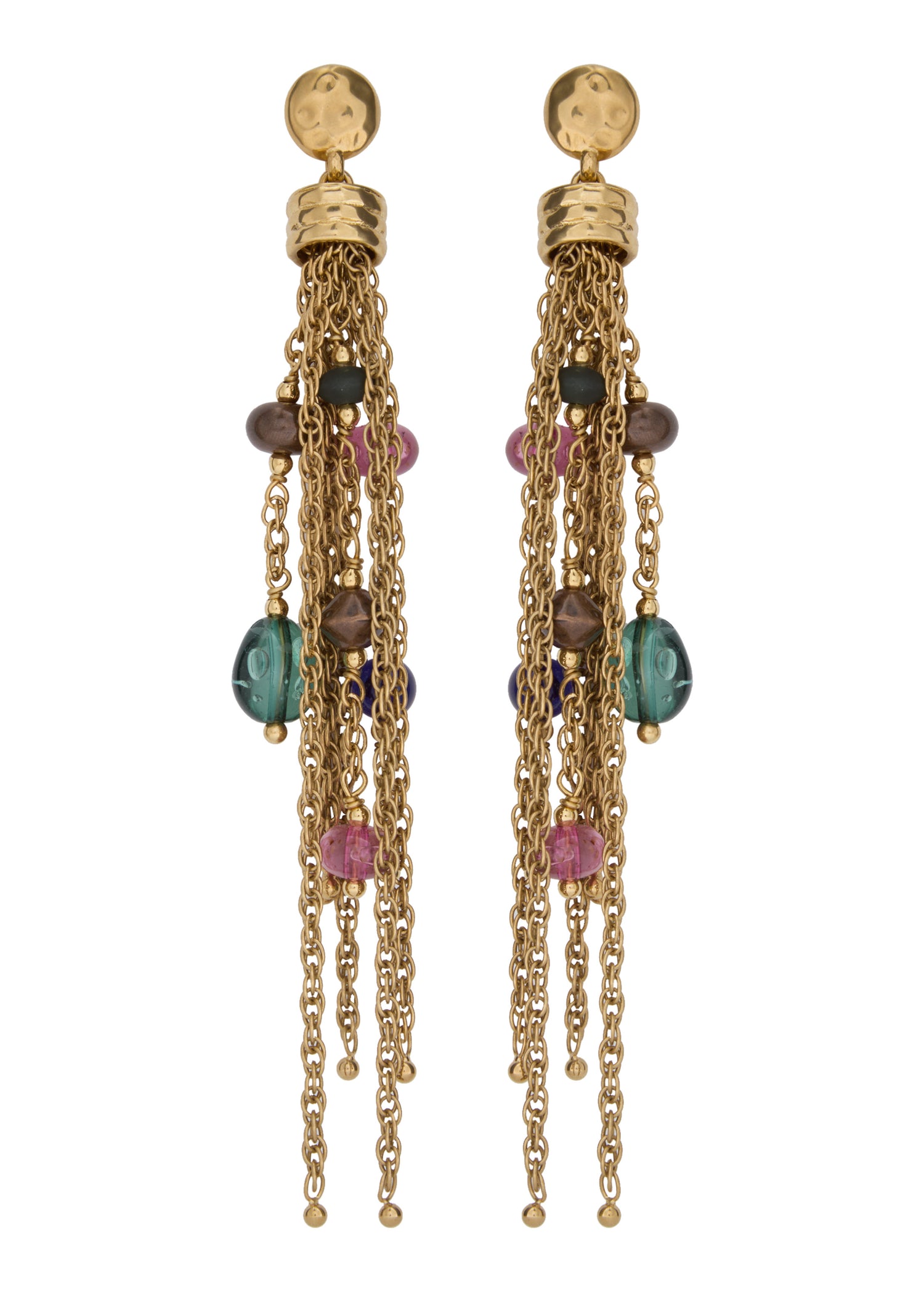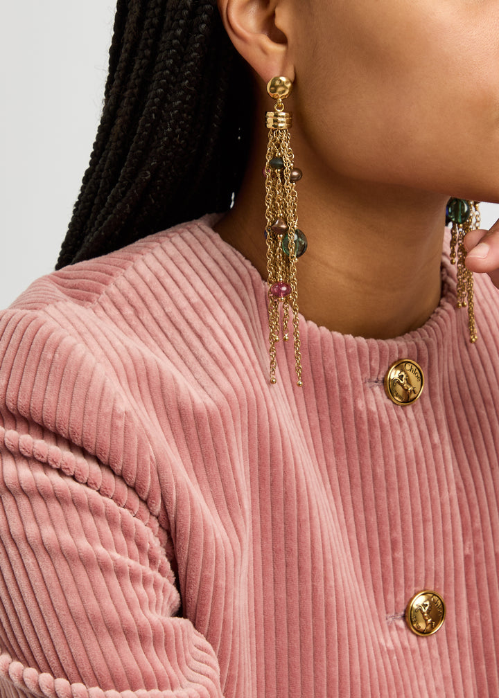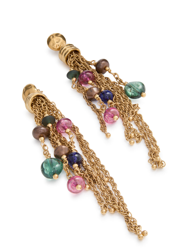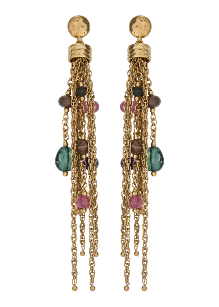 These The Pompoms tassel drop earrings by Chloé are a vibrant and playful statement. The layered chain details are adorned with beautiful faux pearls and crystals, creating a rich and intricate tassel design. These earrings are a bold and luxurious accessory, perfect for adding a touch of colorful, bohemian glamour to your look.