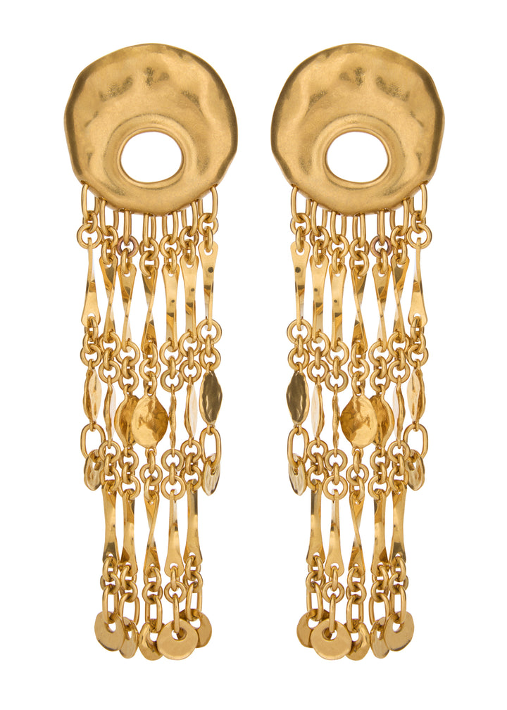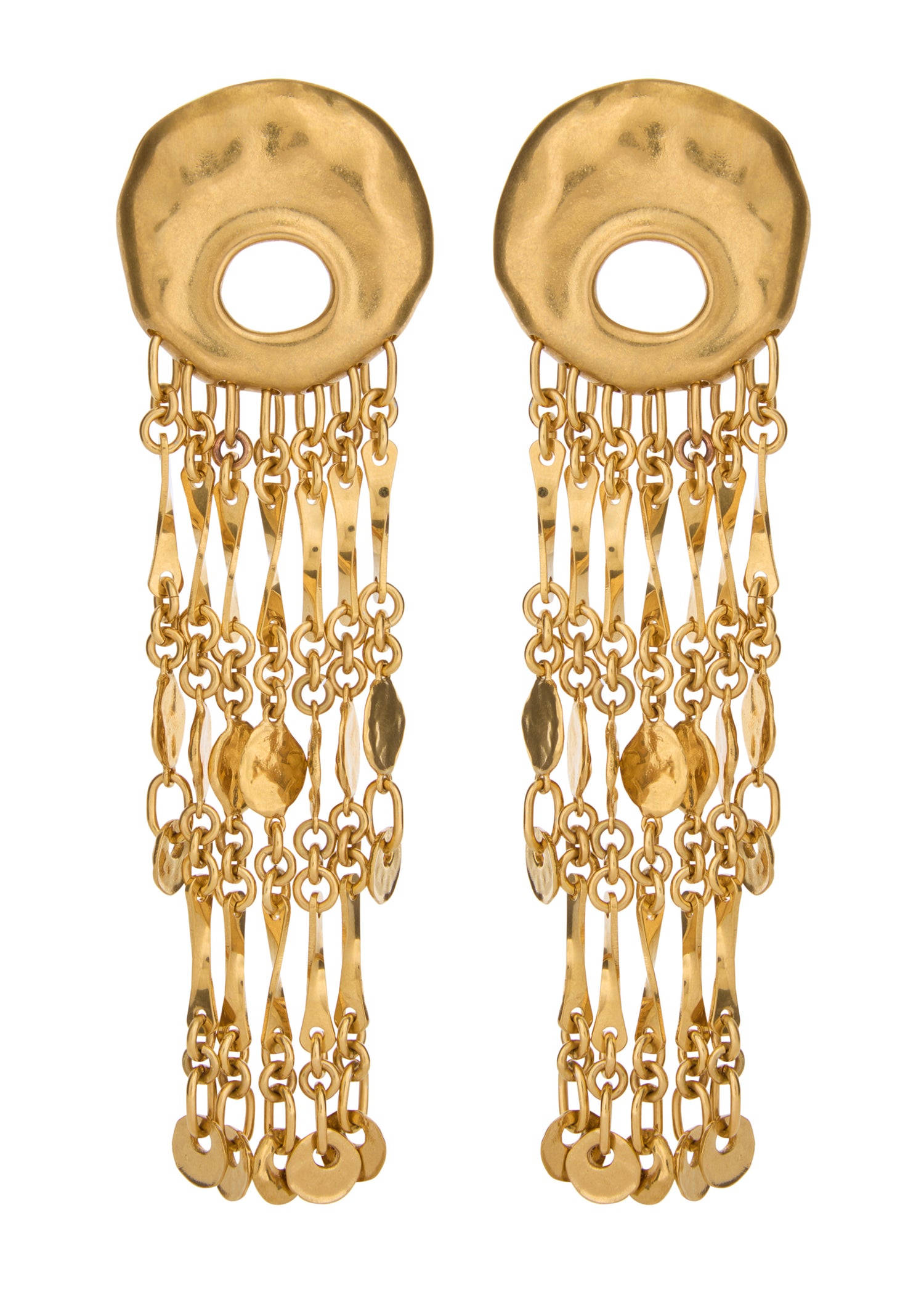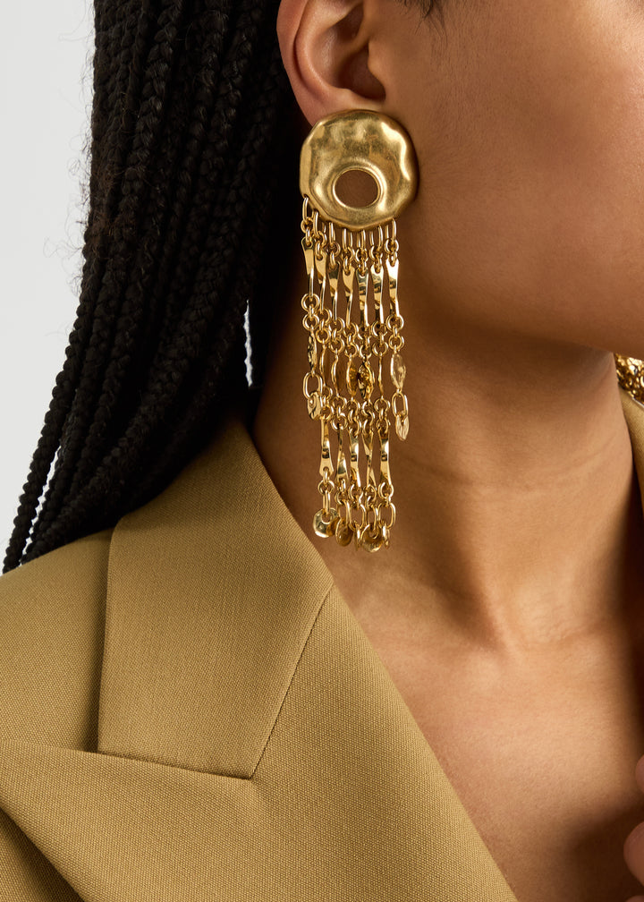 These The Eclectic hammered clip-on drop earrings by Chloé are a striking and artistic statement for those without pierced ears. The sculpted design with a cascade of delicate hanging chains and hammered pendants creates a powerful and dynamic silhouette. These earrings are a perfect accessory for adding a touch of confident, avant-garde style.
