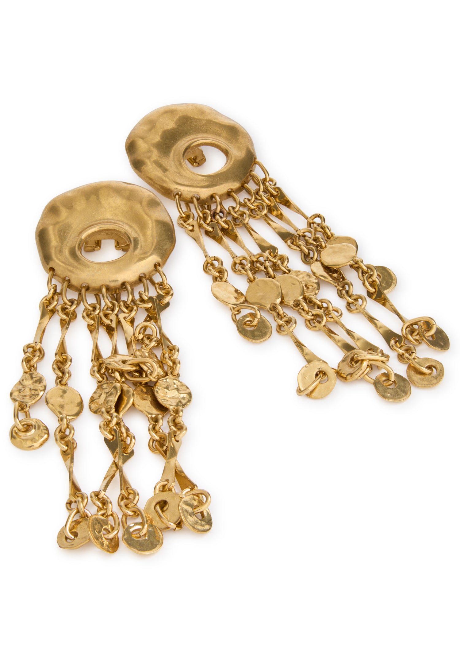 These earrings are crafted from metal with a sculpted design and hammered pendants. They have a clip-on fastening and a dramatic drop of 12cm with a width of 3.5cm.