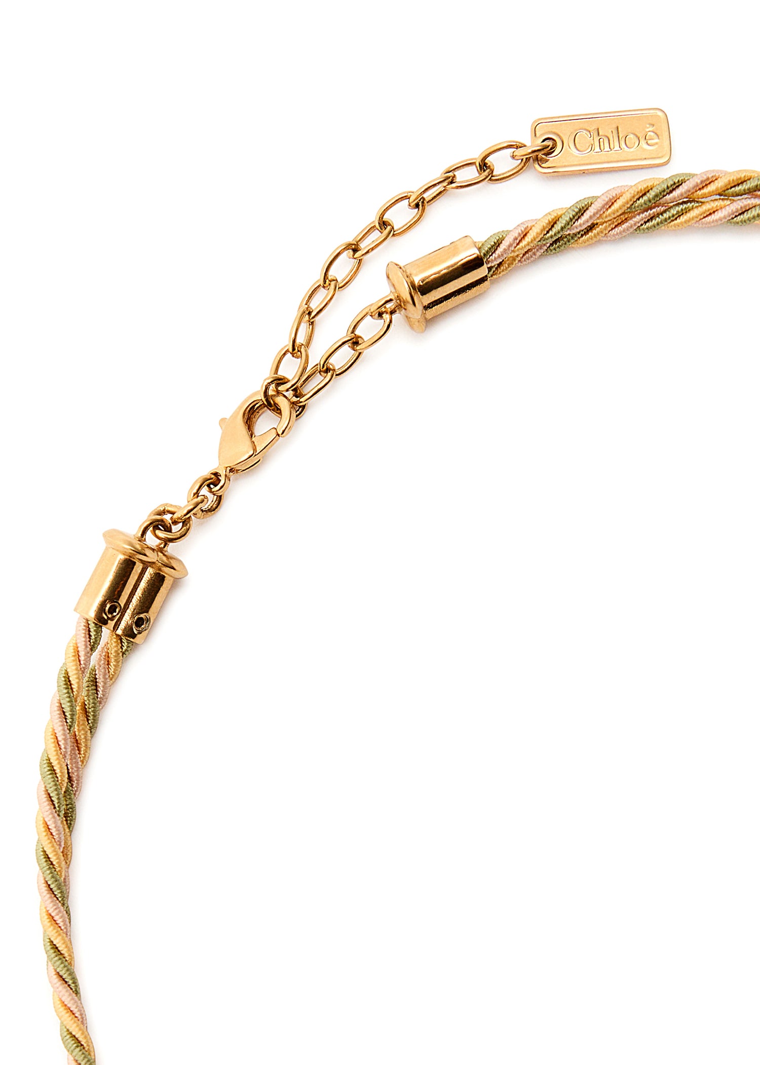 This The Chloé Plage logo necklace by Chloé is a modern and stylish tribute to the beach. The layered, twisted design is beautifully complemented by a logo plaque, creating a sense of effortless, sun-drenched elegance. This necklace is a versatile staple, perfect for adding a touch of high-fashion coastal charm to your neckline.