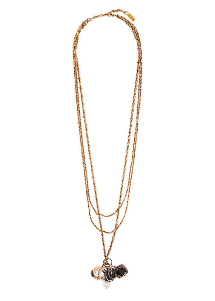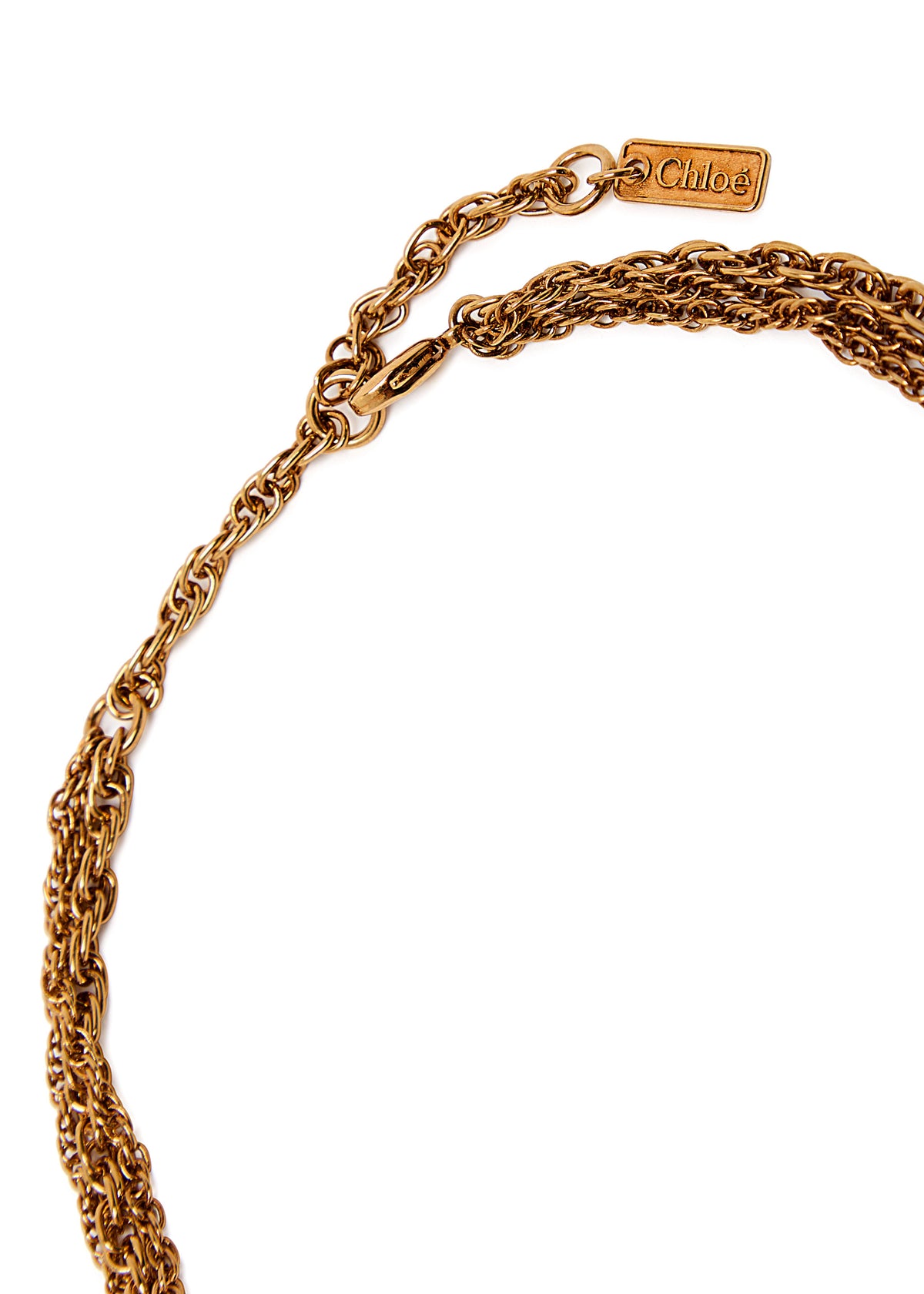This The Chloé Antique Pearls embellished necklace by Chloé is a stunning fusion of classic elegance and modern artistry. The layered design is beautifully adorned with a unique mix of marble, faux pearl, and crystal-embellished ring pendants, creating a luxurious and eclectic silhouette. This long necklace is a perfect statement for adding a touch of vintage-inspired glamour with a contemporary twist.