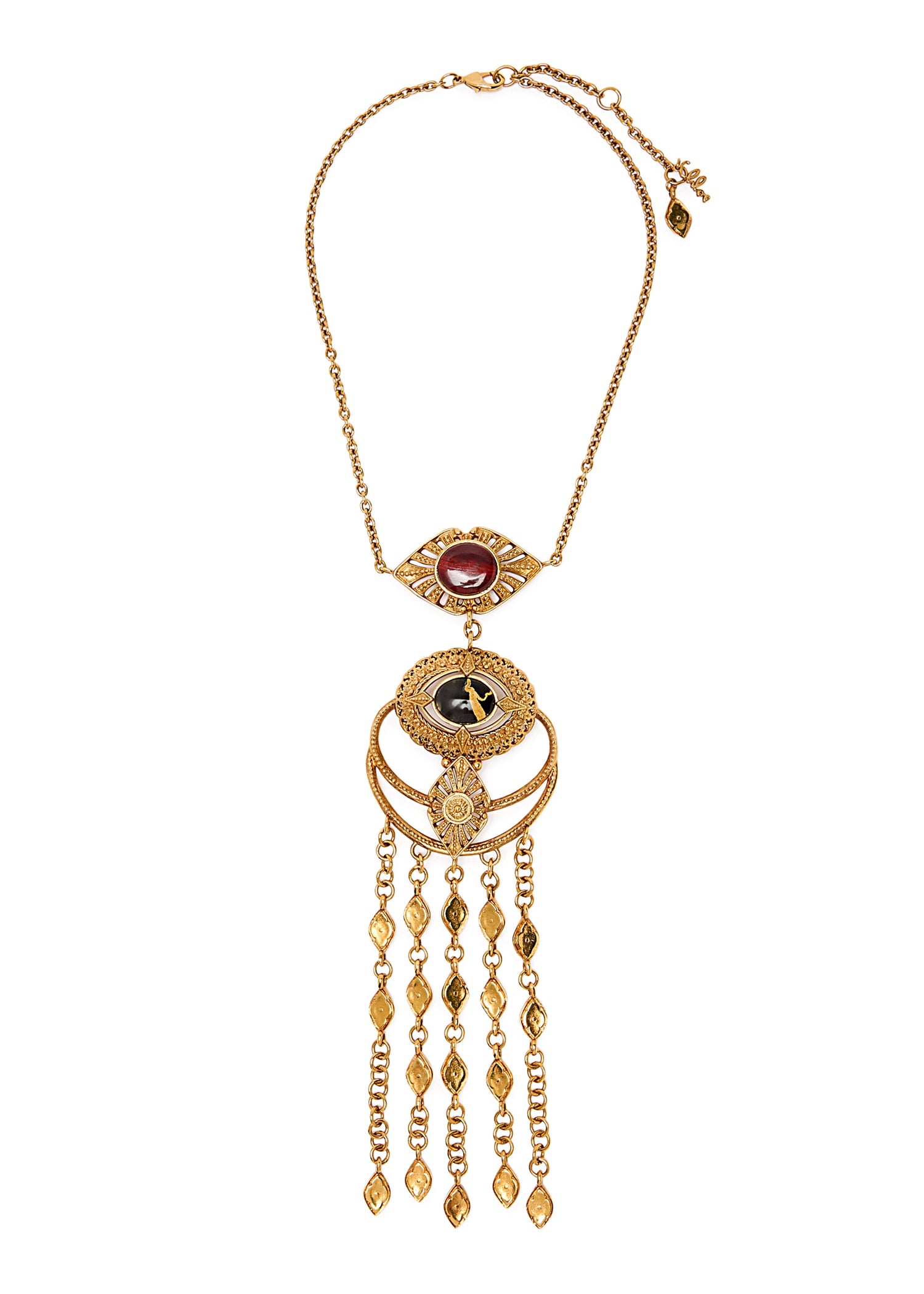 This The Chloé Amulet embellished necklace by Chloé is a bold and luxurious statement. The textured, sculpted design, adorned with red jasper and marble embellishments, creates a powerful and artistic look. The fringed chain trim adds a sense of dynamic movement, making this a truly unique and high-fashion piece.