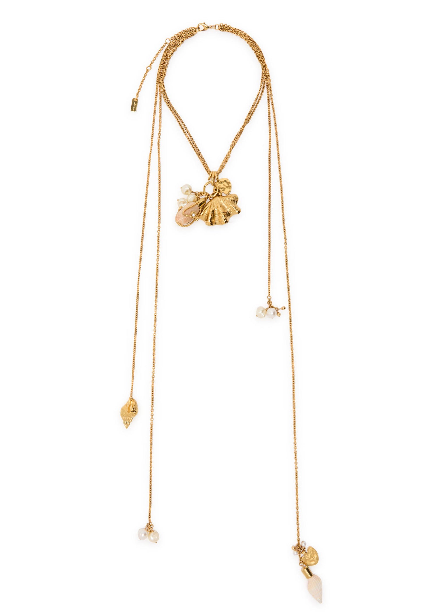 This necklace is crafted from metal with a layered design and features shell pendants and faux pearl embellishments. It has an adjustable lobster clasp fastening with a length between 38cm and 48cm.