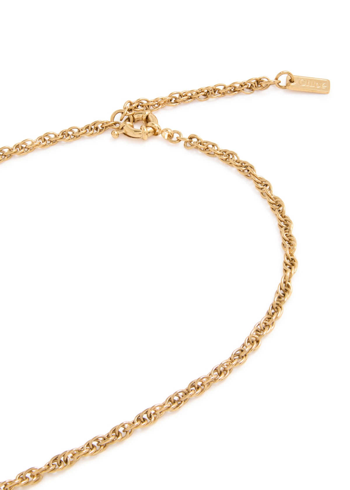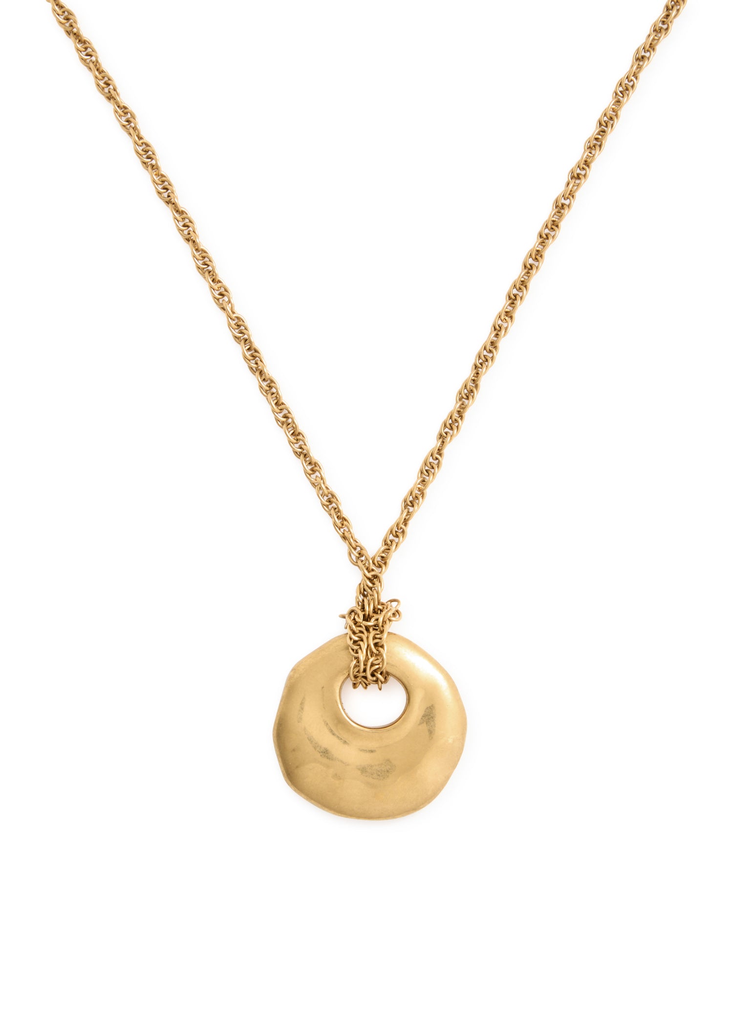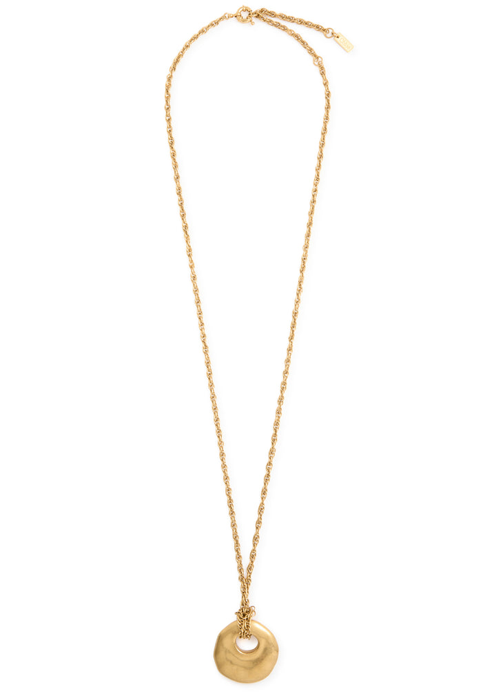 This Eclectic pendant necklace by Chloé is a beautiful and artistic statement. The long, delicate chain is complemented by a large, sculpted hammered pendant, which adds a sense of organic, earthy luxury. This necklace is perfect for adding a touch of bohemian elegance and is ideal for layering with other pieces.
