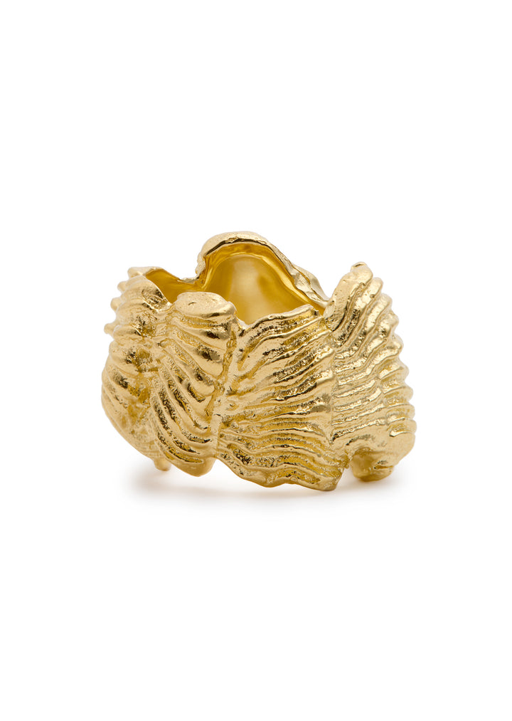 This handmade ring is crafted from 18kt gold-plated metal with a chunky, sculpted design and a textured finish. It has a width of 2cm.