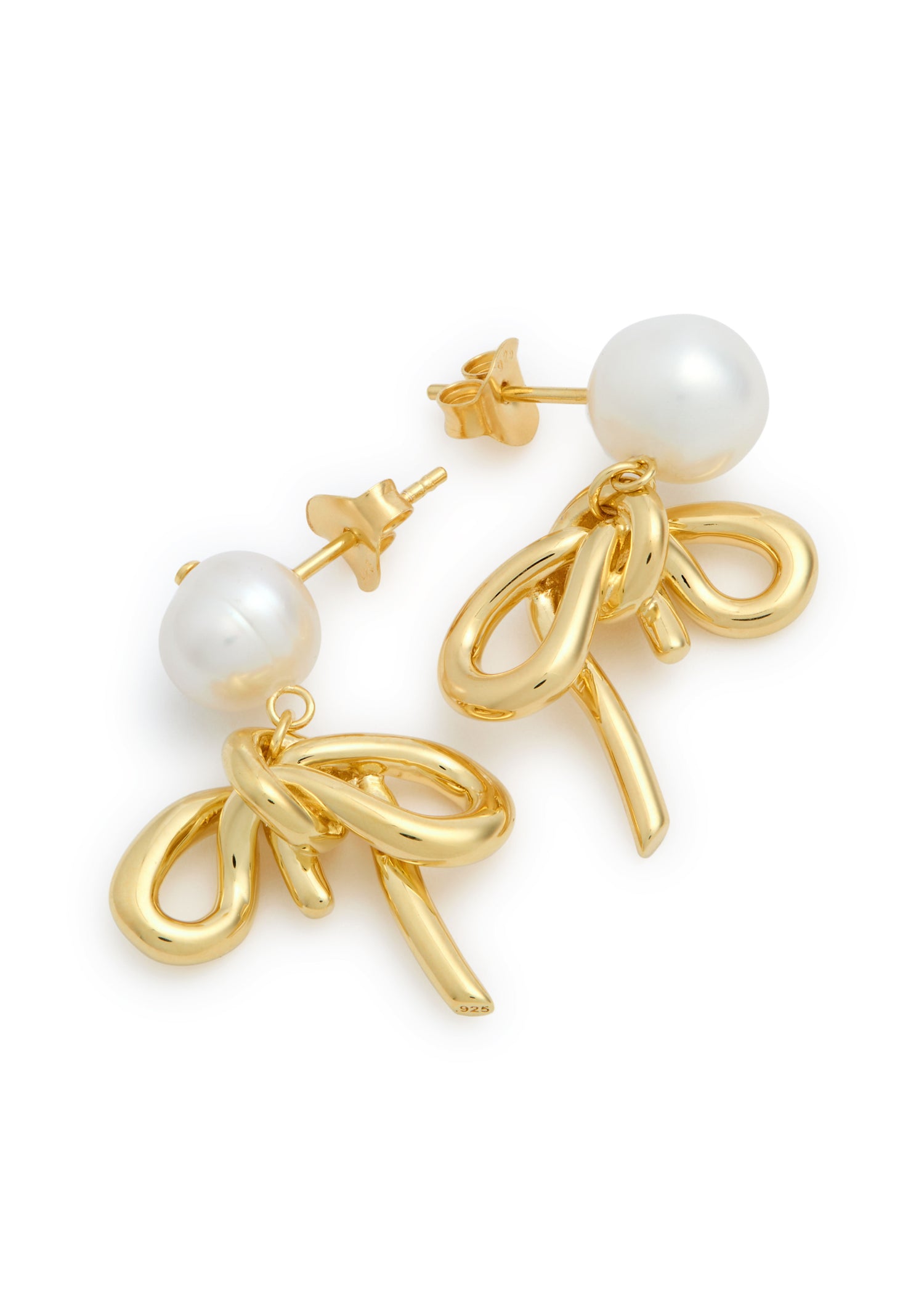 These hand-finished earrings are crafted from 18kt gold-plated metal. They feature a freshwater pearl embellishment and a sculpted bow charm. They have a butterfly fastening and a 3.5cm drop.