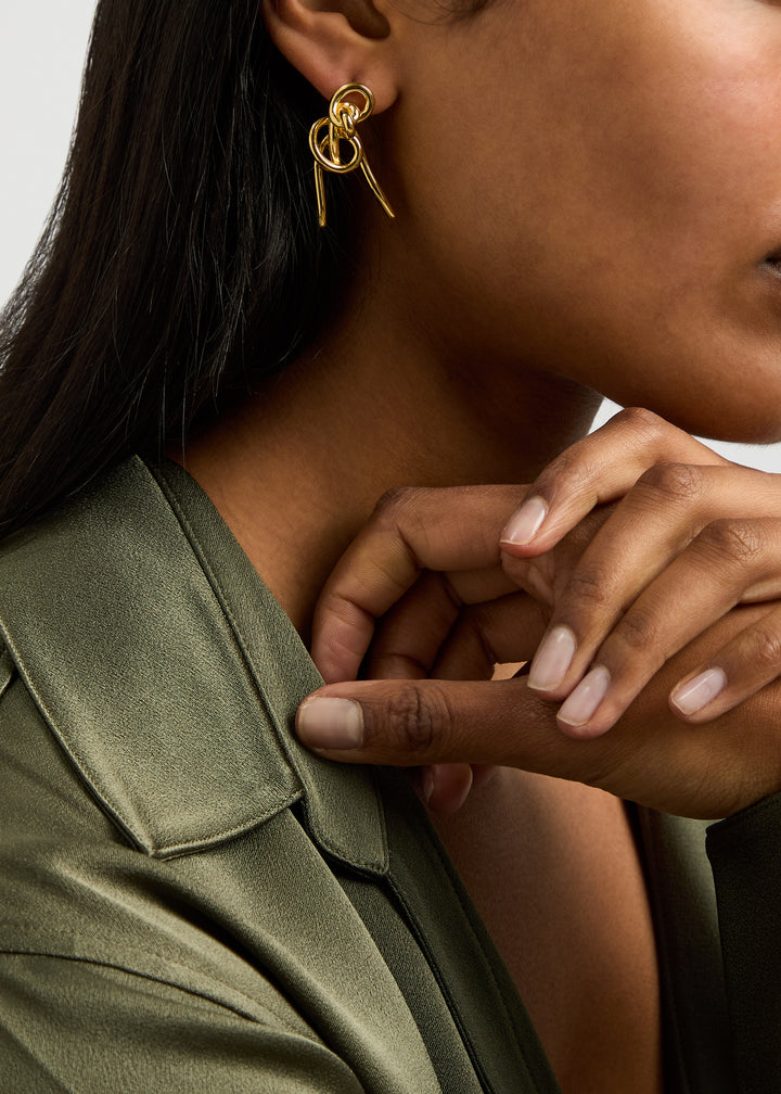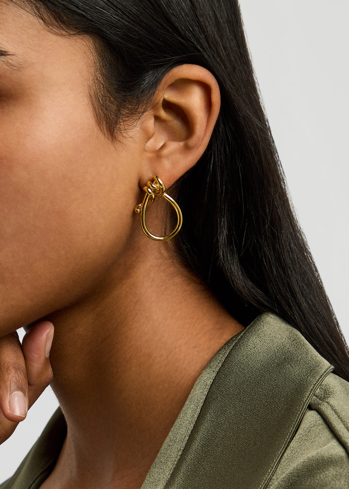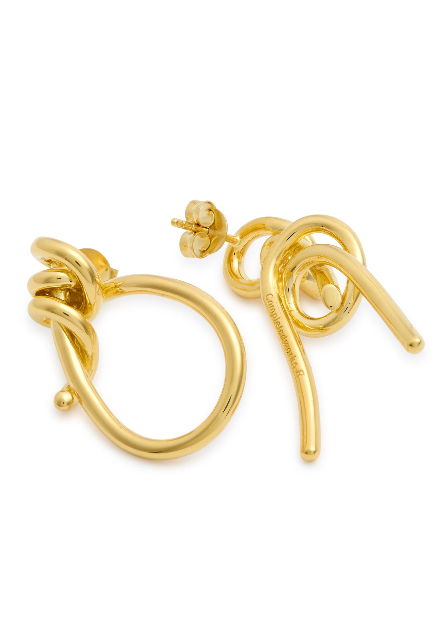 These handmade earrings are crafted from 18kt gold vermeil with an asymmetric knot design. They have a butterfly fastening and measure 2cm x 3cm for one earring and 3.2cm x 1.5cm for the other.