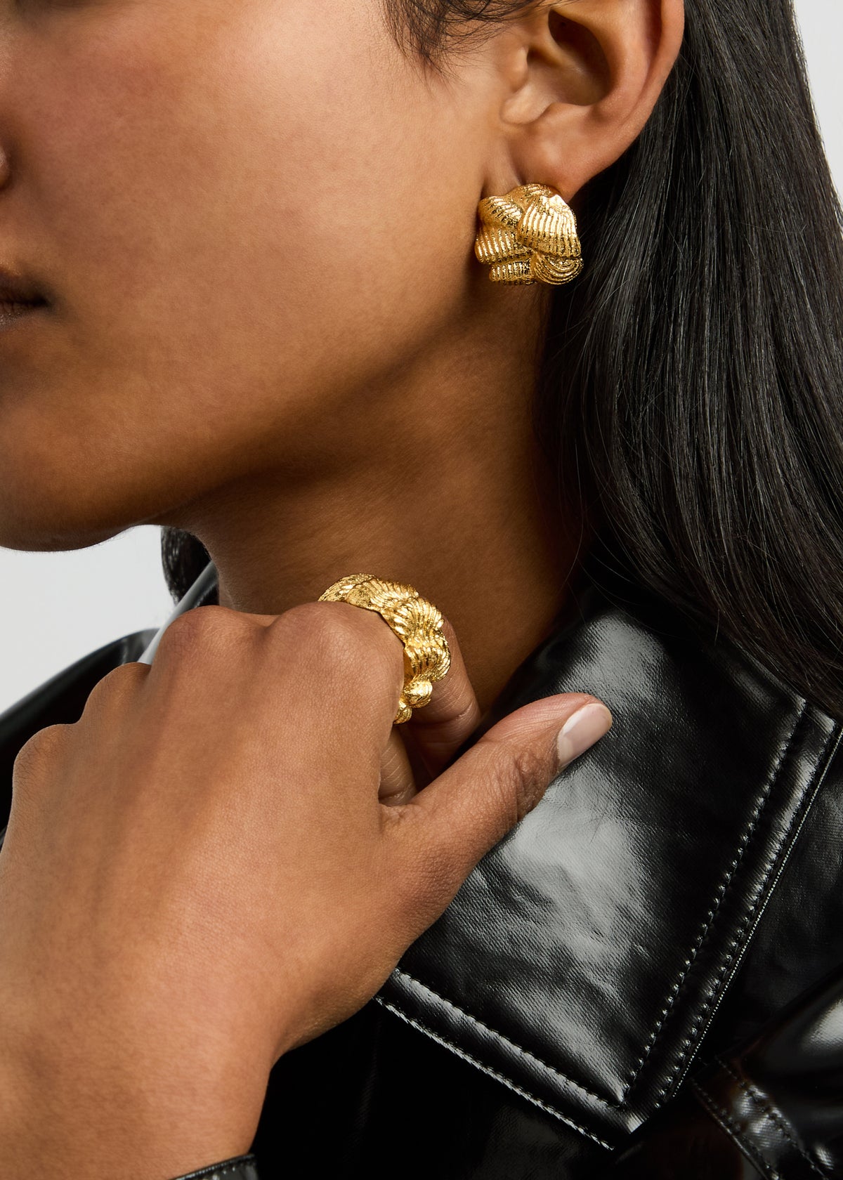 These handmade earrings are crafted from 18kt gold-plated metal with a sculpted design and textured finish. They have a butterfly fastening and measure 2cm x 2.5cm.