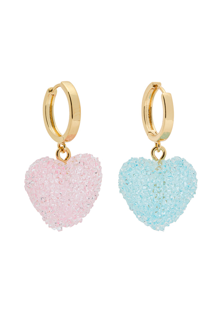 These Jelly Heart 18kt gold-plated hoop earrings by Crystal Haze are a whimsical and charming statement. The unique mismatched design, with its two different colored, textured resin heart pendants, creates a fun and eclectic aesthetic. These earrings are perfect for adding a touch of playful elegance and a pop of vibrant, carefree color to your look.