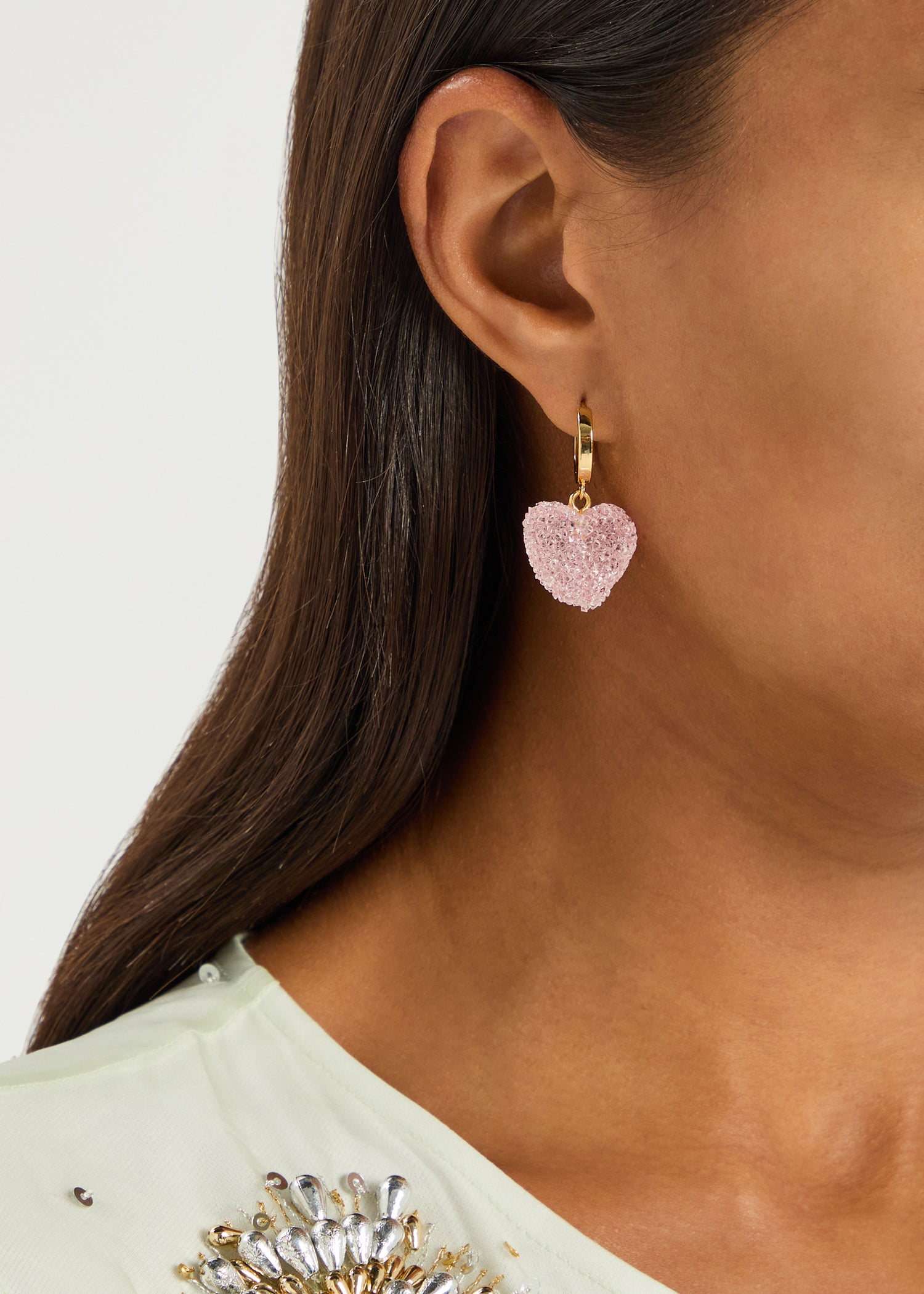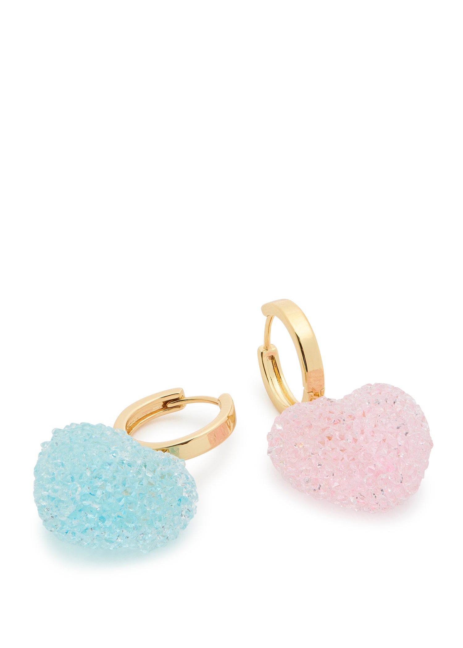 These mismatched hoop earrings are crafted from 18kt gold-plated brass. They feature textured resin heart pendants, a sleeper fastening, and a 3.4cm drop.