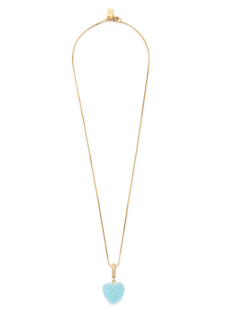 This Jelly Heart 18kt gold-plated necklace by Crystal Haze is a vibrant and playful statement. The gold-plated chain is beautifully adorned with a textured resin heart pendant, which is connected by a sparkling crystal embellishment. This necklace is a fun and charming accessory, perfect for adding a pop of joyful, carefree style to your neckline.