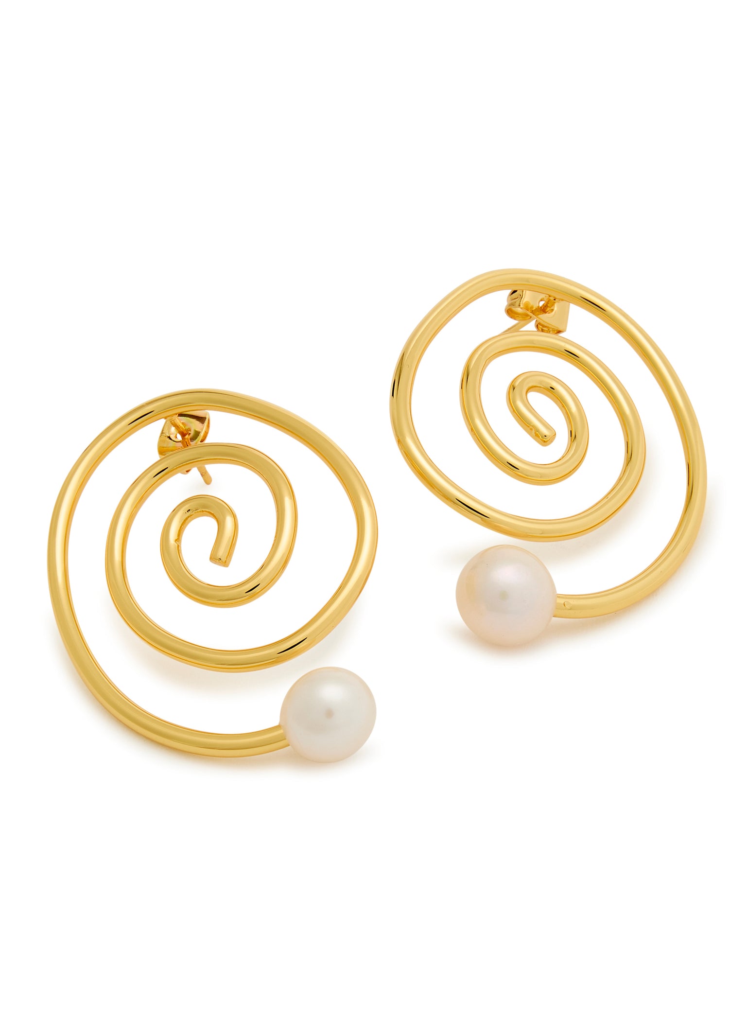These handmade drop earrings are crafted from 18kt gold-plated on recycled brass with a sculpted spiral design and freshwater pearl embellishments. They have a butterfly fastening and measure 4.3cm x 3.1cm.