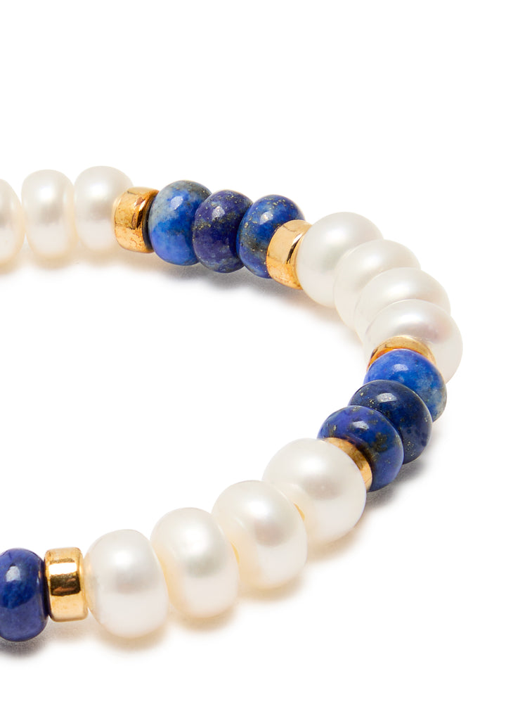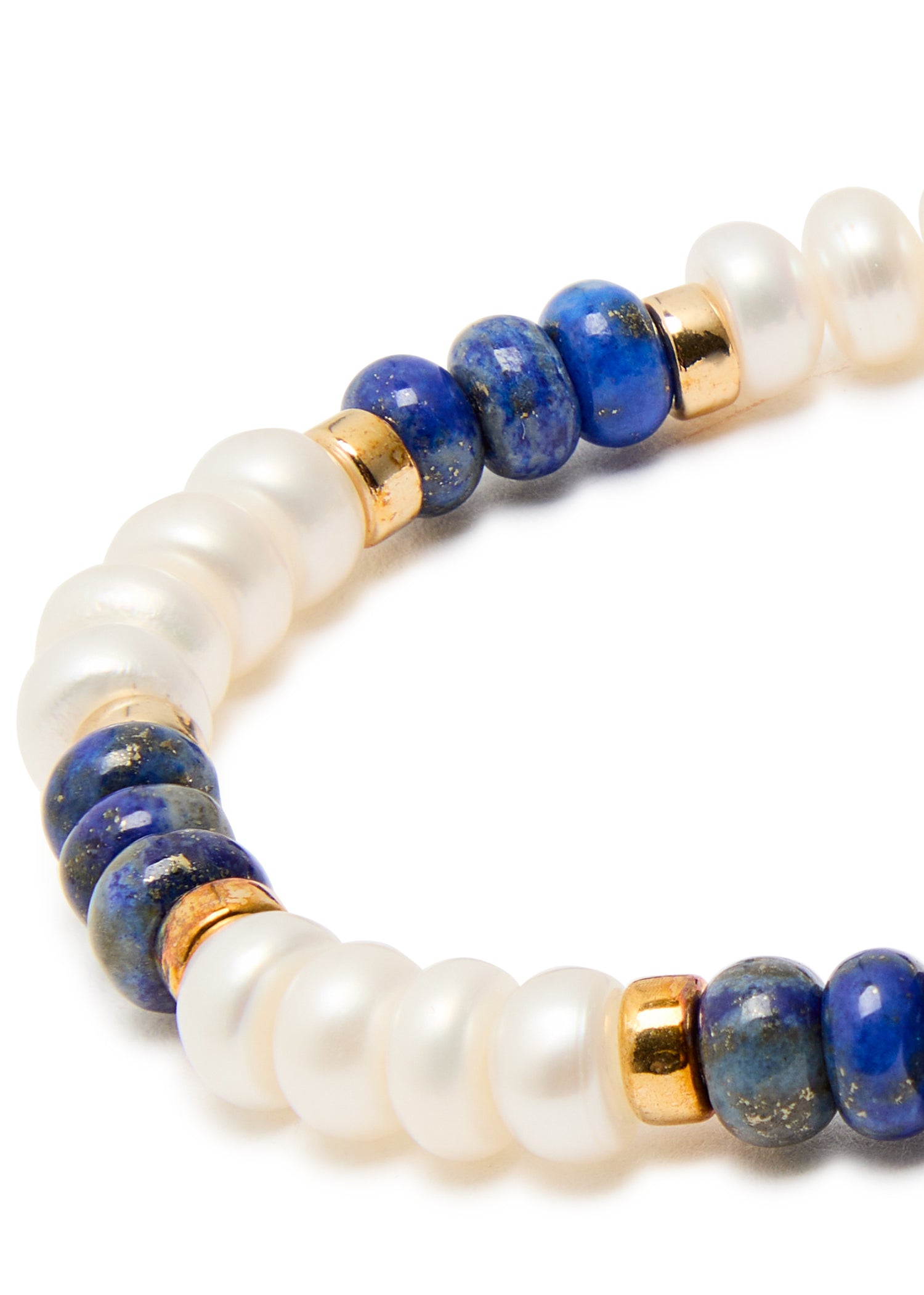 This handmade bracelet is elasticated and features freshwater pearls, lapis lazuli beads, and 18kt gold-plated rondelles. It is a slip-on design.