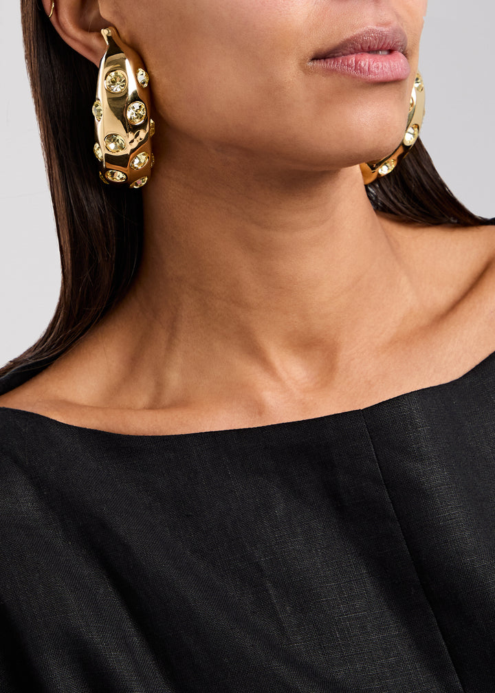 These Les Boucles Bananes crystal-embellished drop earrings by Jacquemus are a whimsical and playful statement. The sculpted banana design is beautifully adorned with sparkling crystal embellishments, creating a perfect blend of surrealism and luxury. These earrings are a perfect accessory for adding a touch of unique, artistic glamour.