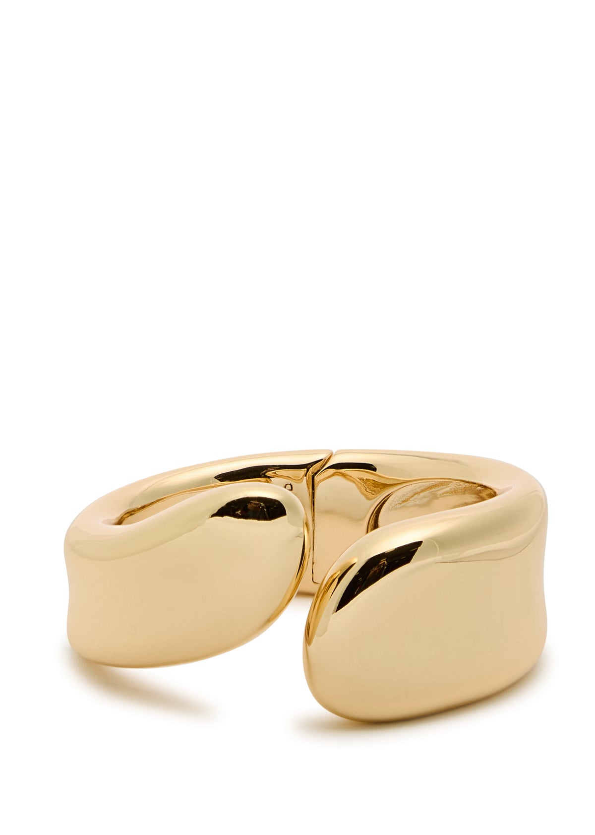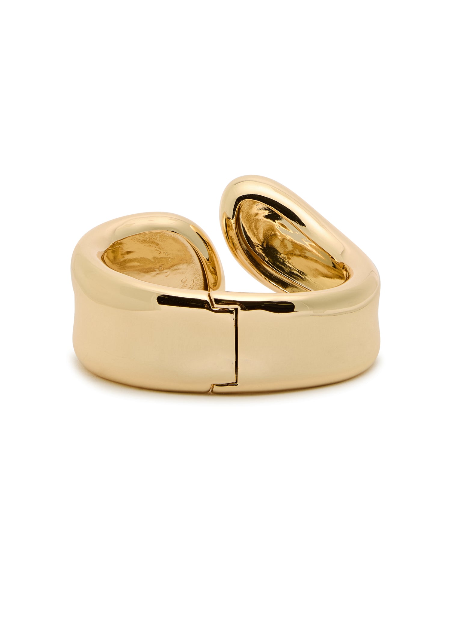 This cuff is crafted from 14kt gold-plated metal with a sculpted design. It has a hinge-clasp fastening and a band width of 4.4cm.