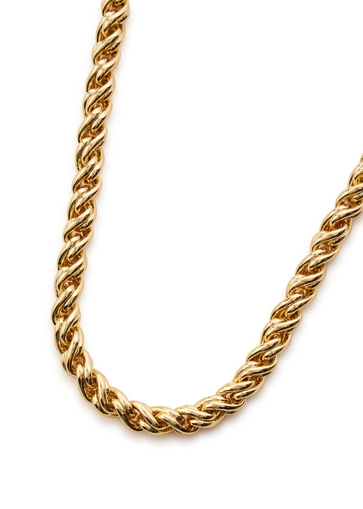 This necklace is crafted from either 14kt gold-plated or silver-plated brass with a chain design. It has a hinge-clasp fastening and a length of 50cm.