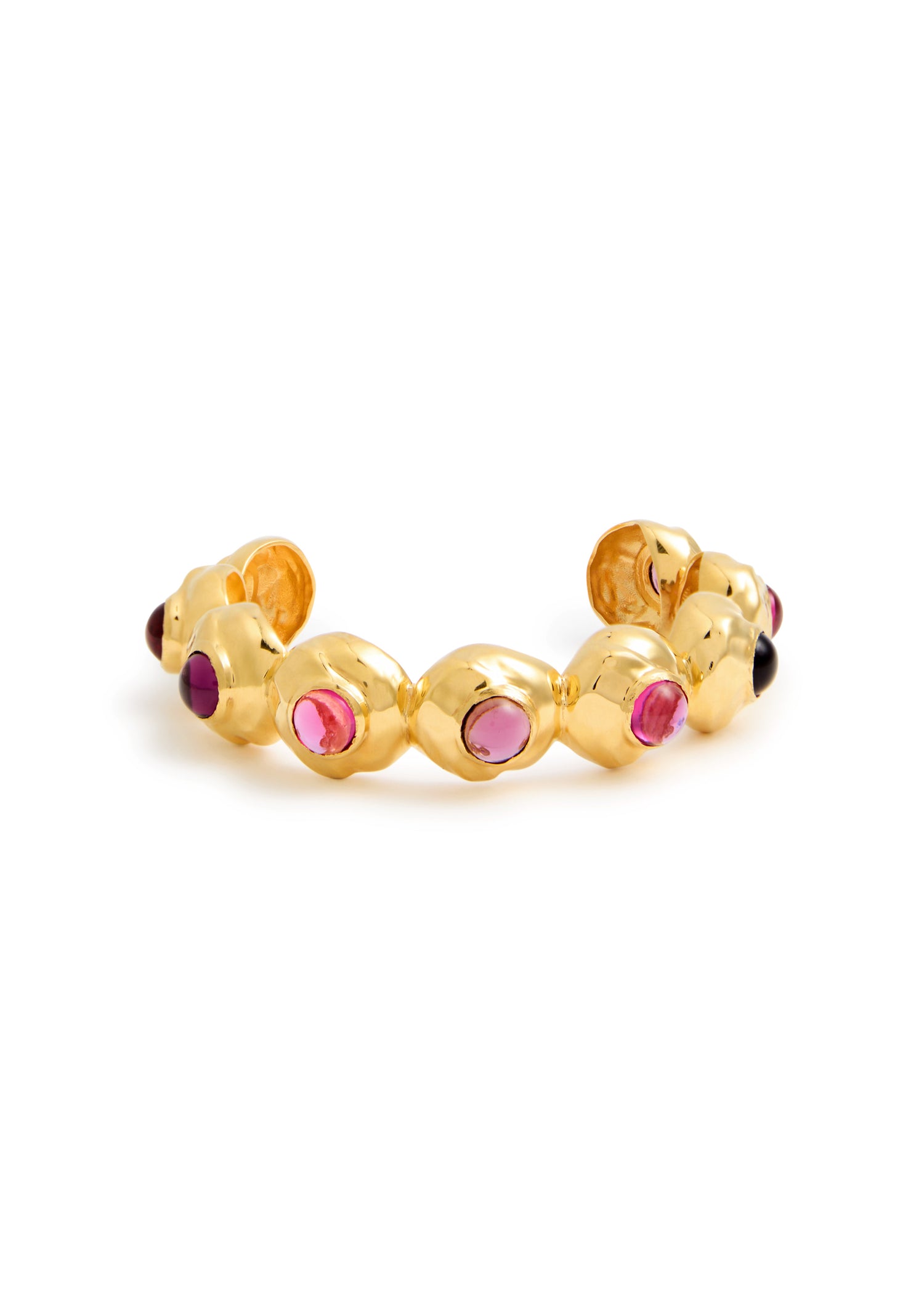 This handmade cuff is crafted from 18kt gold-plated metal. It features a sculpted design with cabochon crystal-embellishments and a width of 1.5cm and an inner circumference of 13.5cm.