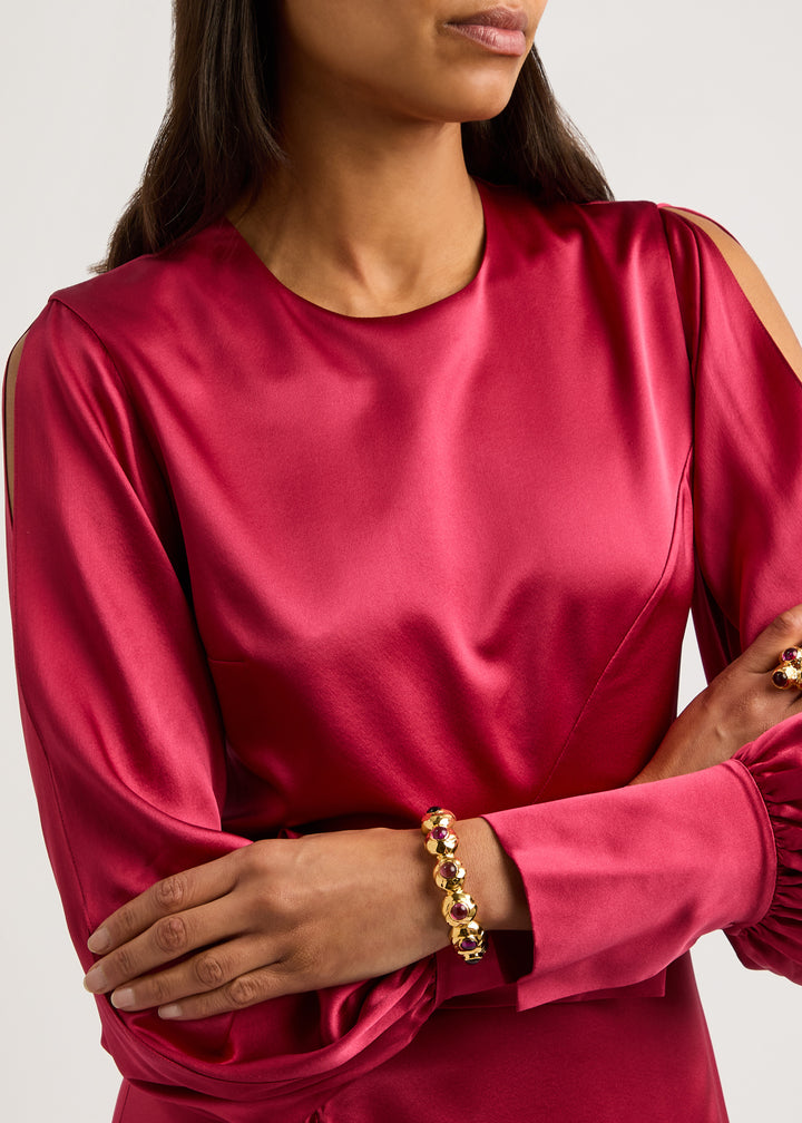 This Wave crystal-embellished 18kt gold-plated cuff by Joanna Laura Constantine is a bold and fluid statement. The sculpted wave design is beautifully adorned with rich cabochon crystal embellishments, creating a sense of dynamic movement and luxurious elegance. This cuff is a perfect accessory for adding a touch of confident, high-fashion flair.