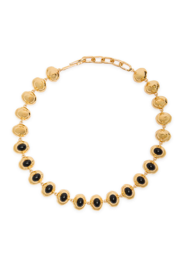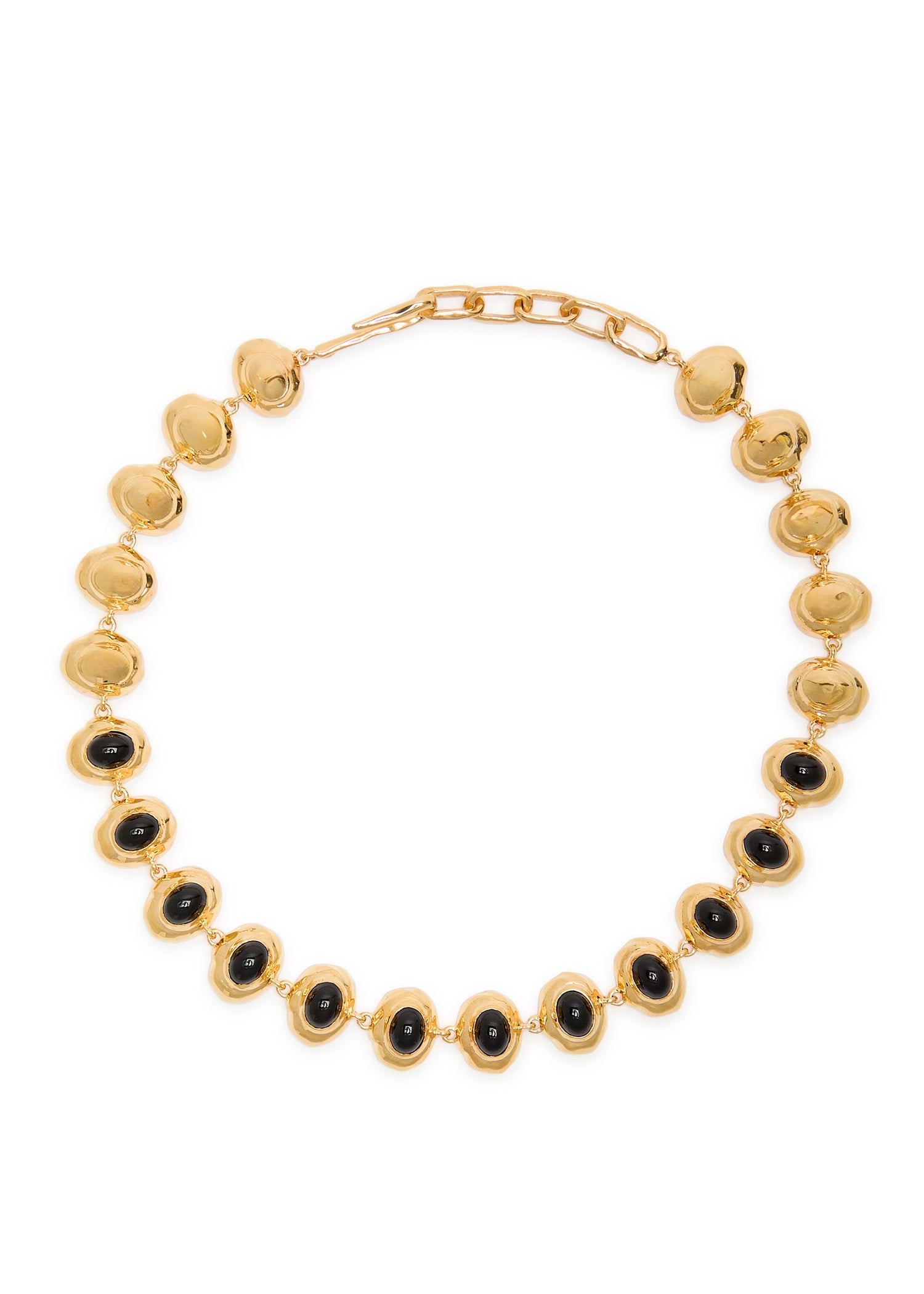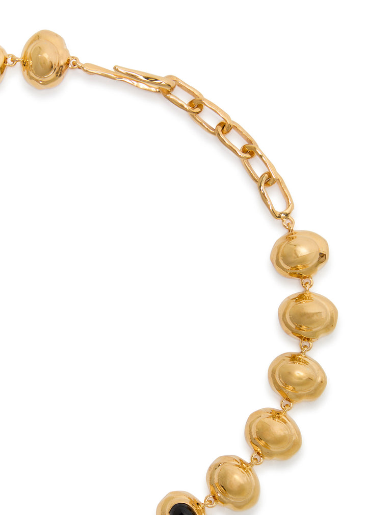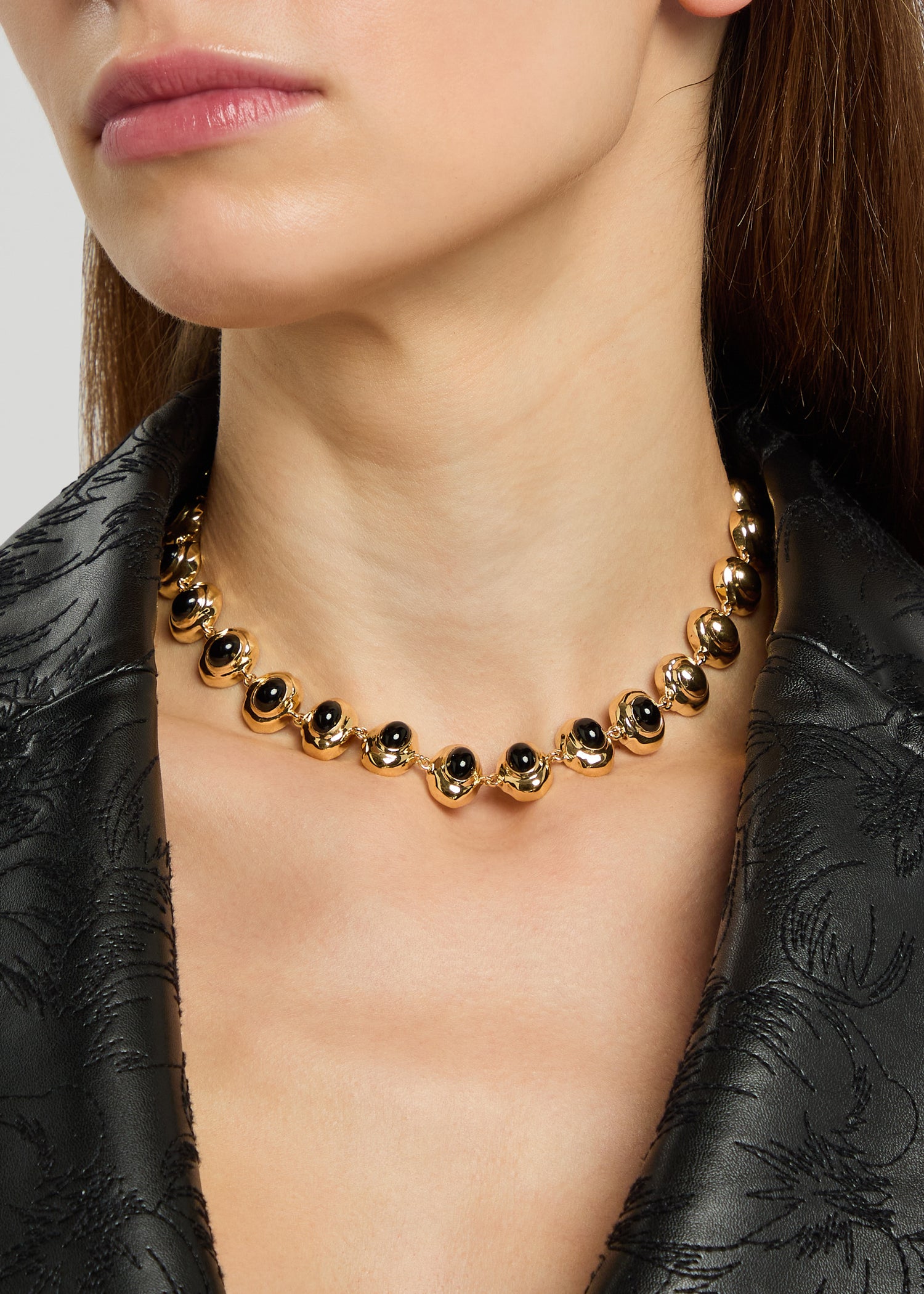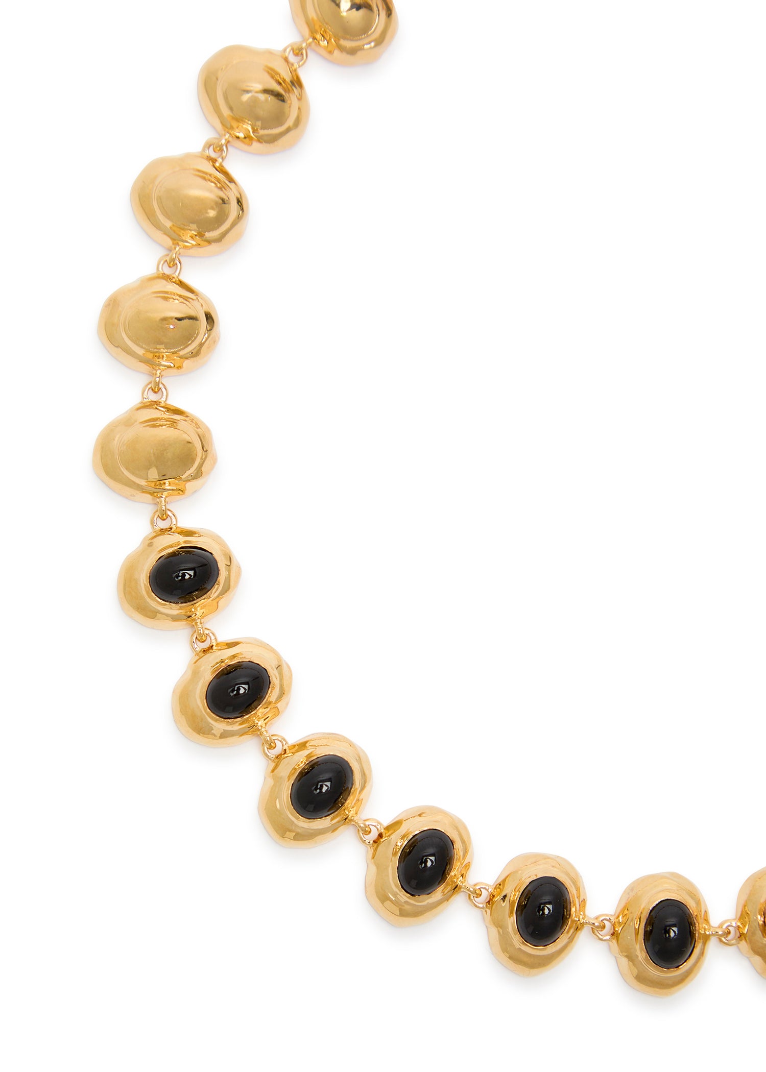 This handmade choker is crafted from 18kt gold-plated brass. It features a sculpted design with cabochon crystal embellishments and has an adjustable hook fastening, with a length of 37cm.