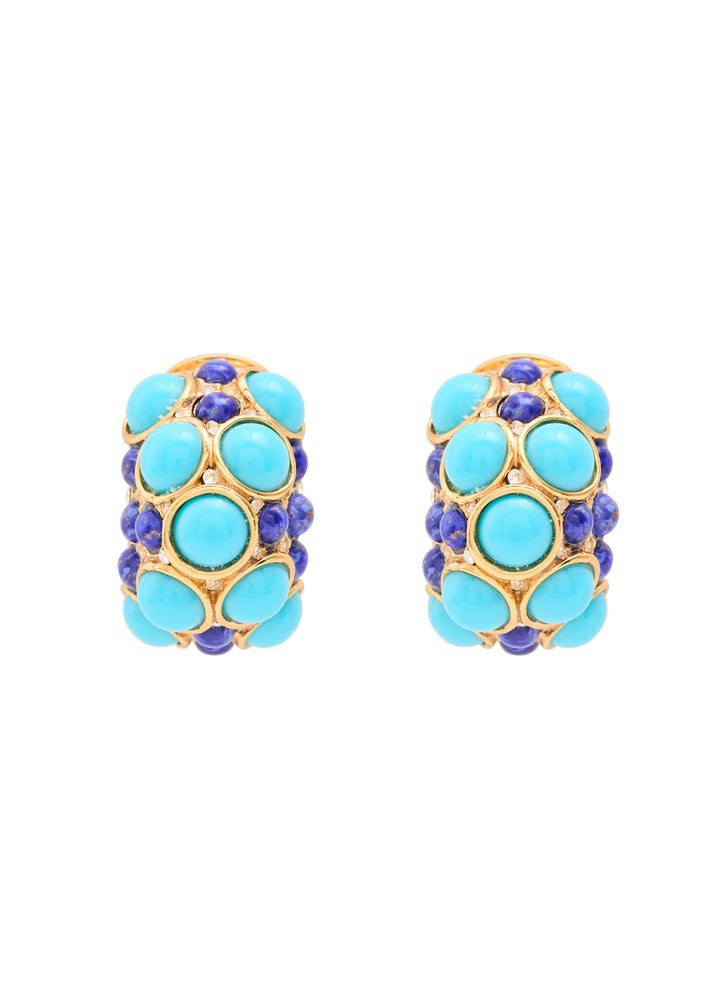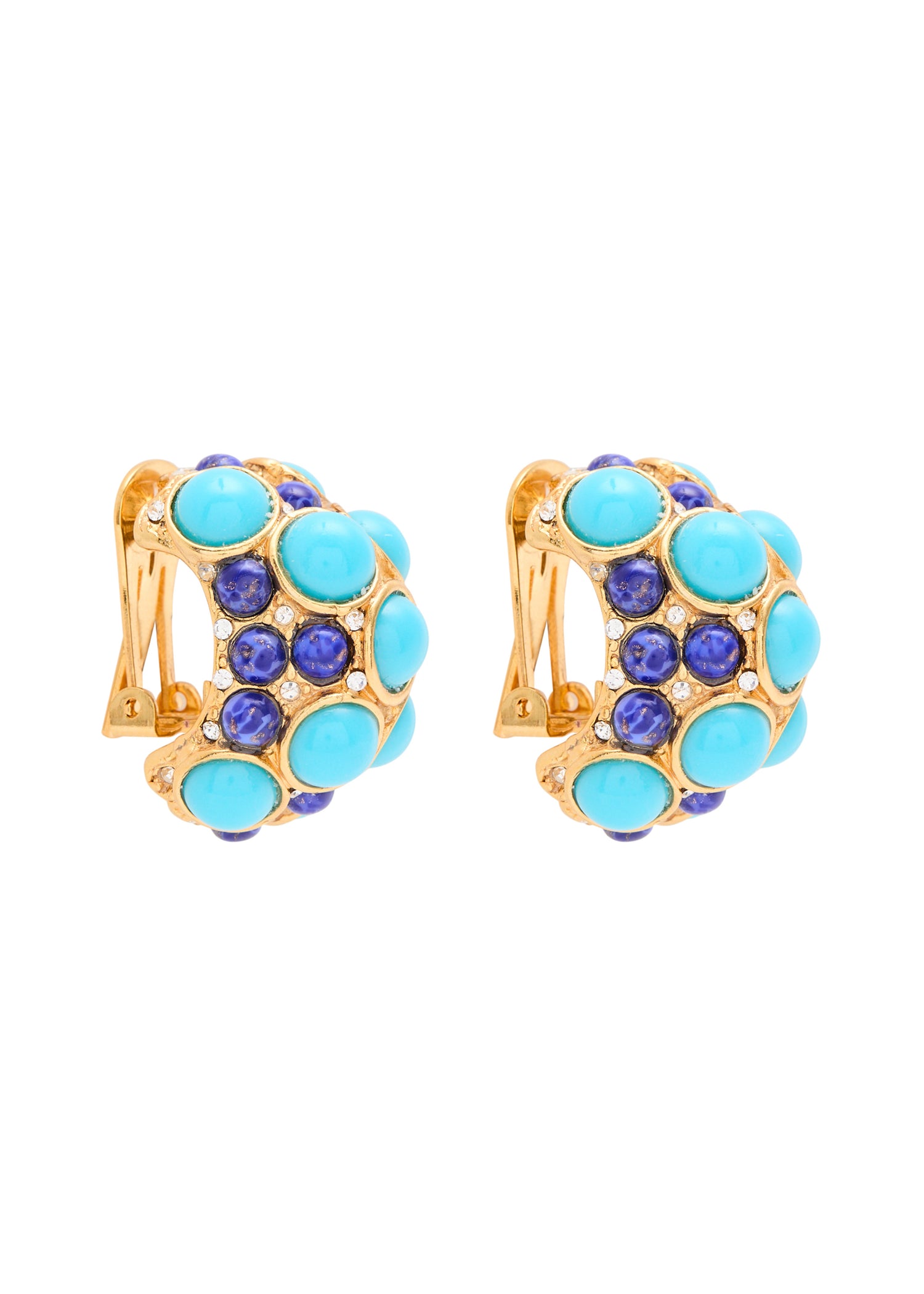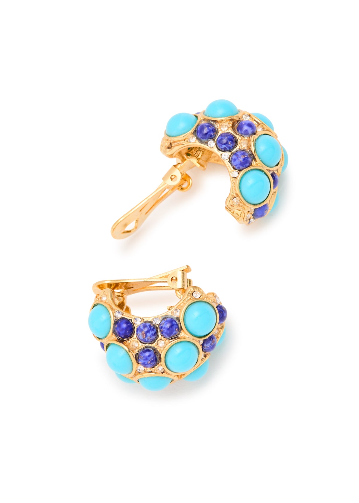 These Gemstone 22kt gold-plated clip-on hoop earrings by Kenneth Jay Lane are a vibrant and luxurious statement for those without pierced ears. The sculpted design is beautifully adorned with rich cabochon and lapis gemstones and sparkling crystal embellishments. These hoops are a perfect accessory for adding a touch of confident, high-fashion flair and a vibrant pop of color.