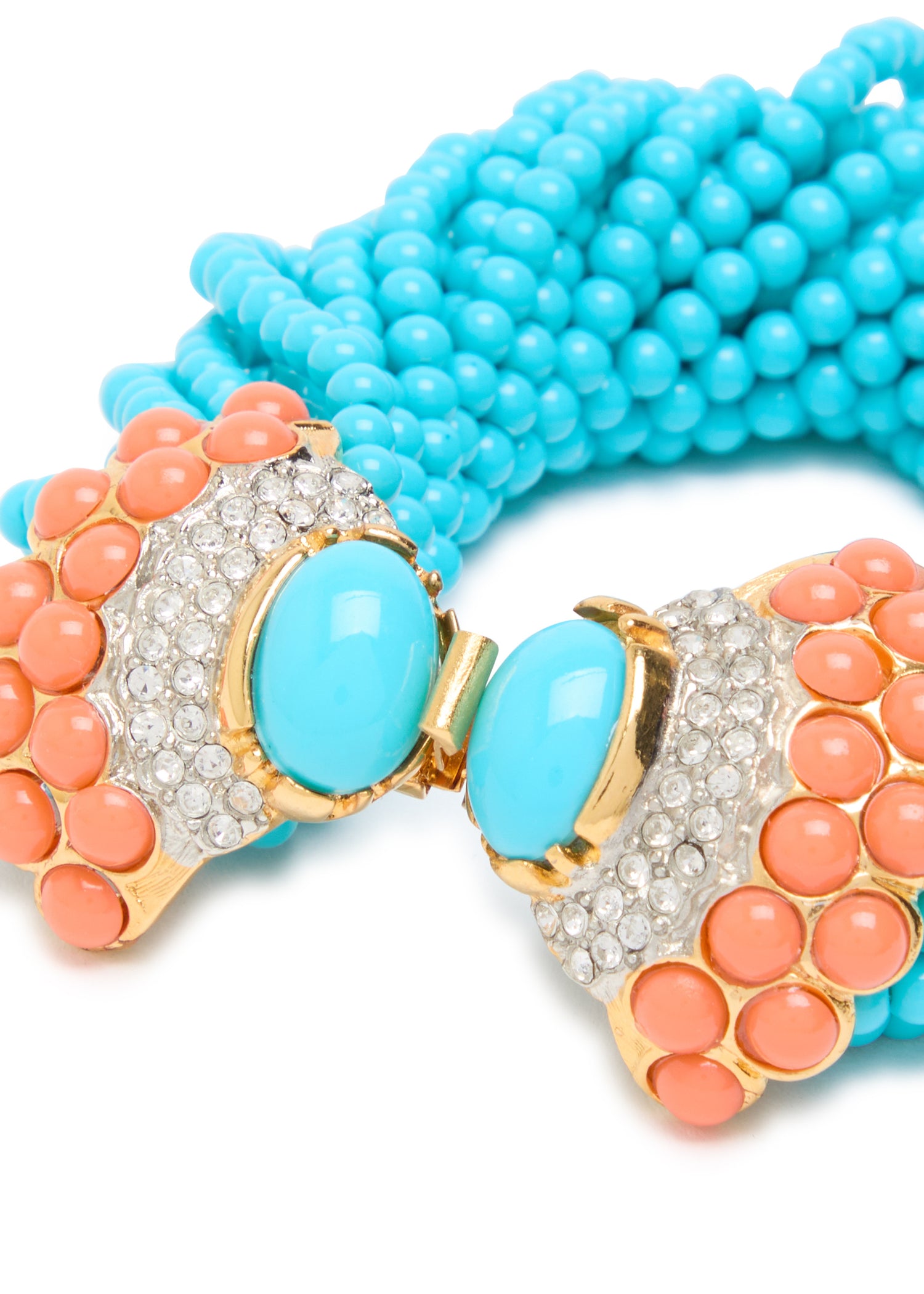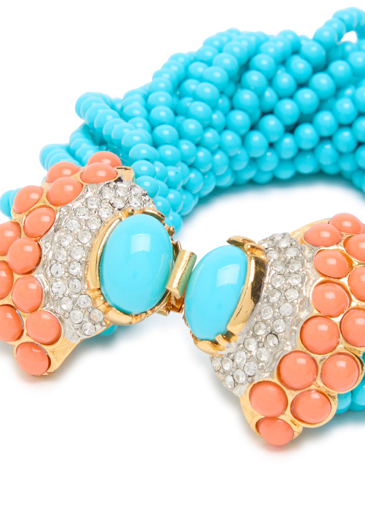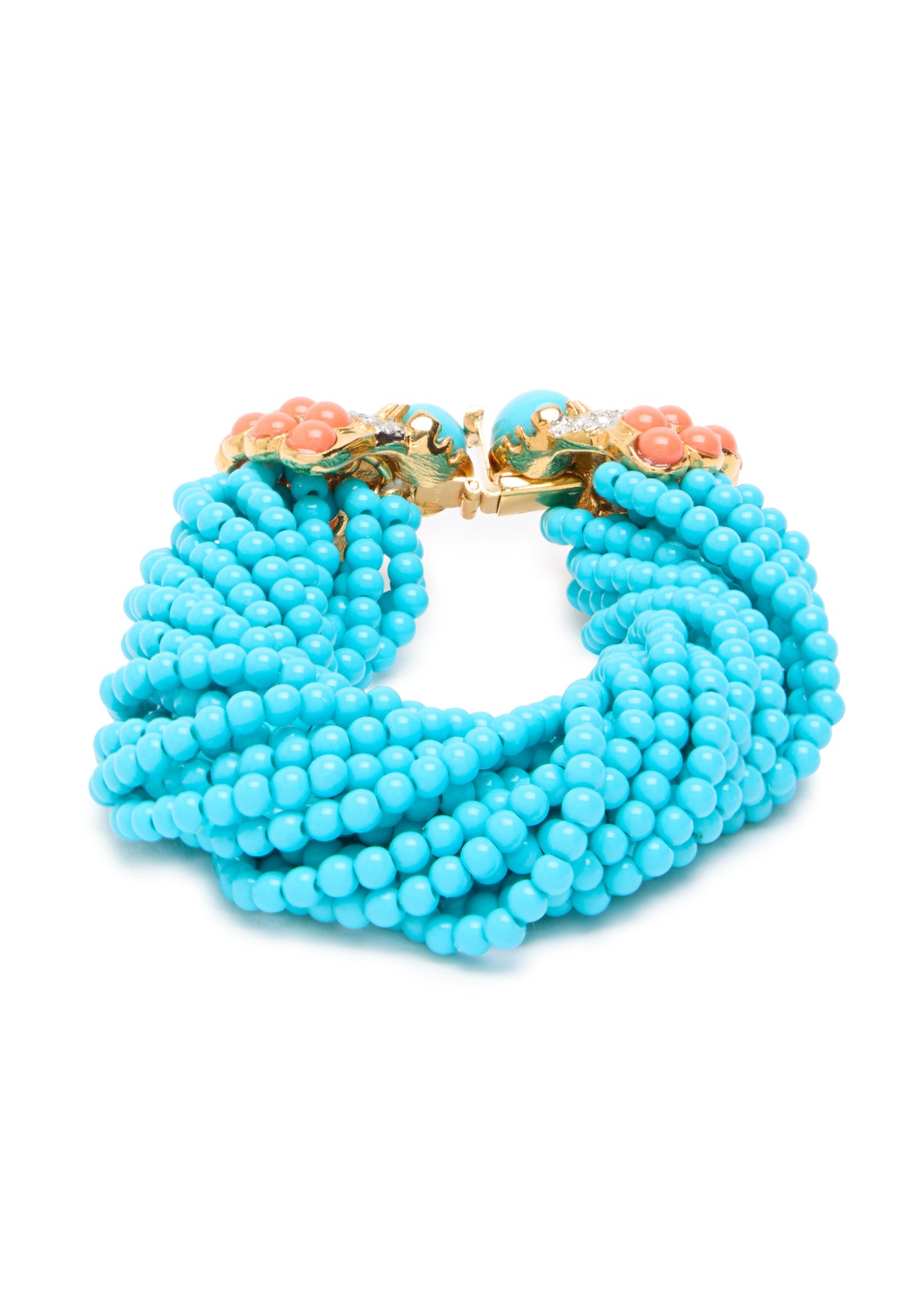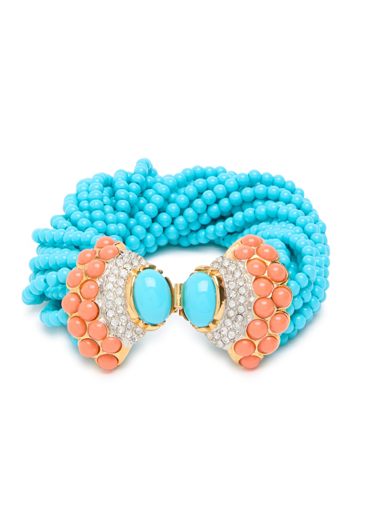 This Beaded 22kt gold-plated bracelet by Kenneth Jay Lane is a bold and luxurious statement. The multi-row, beaded design is beautifully adorned with vibrant cabochon gemstones and sparkling crystal embellishments. This bracelet is a perfect accessory for adding a touch of confident, high-fashion glamour and a vibrant pop of color.