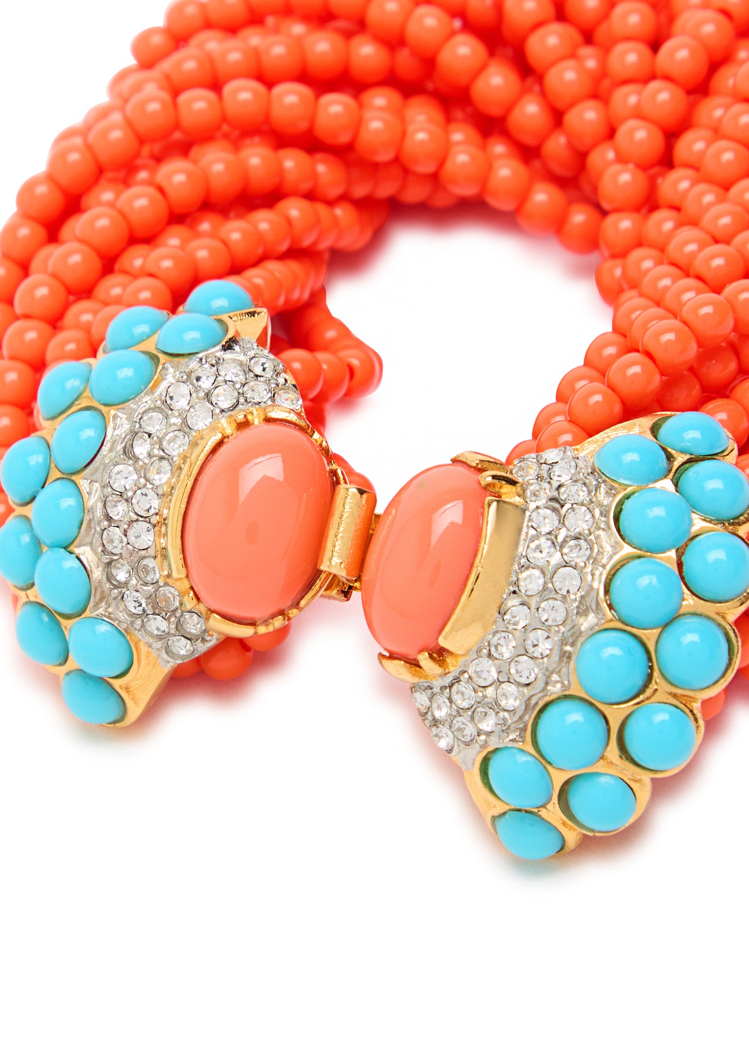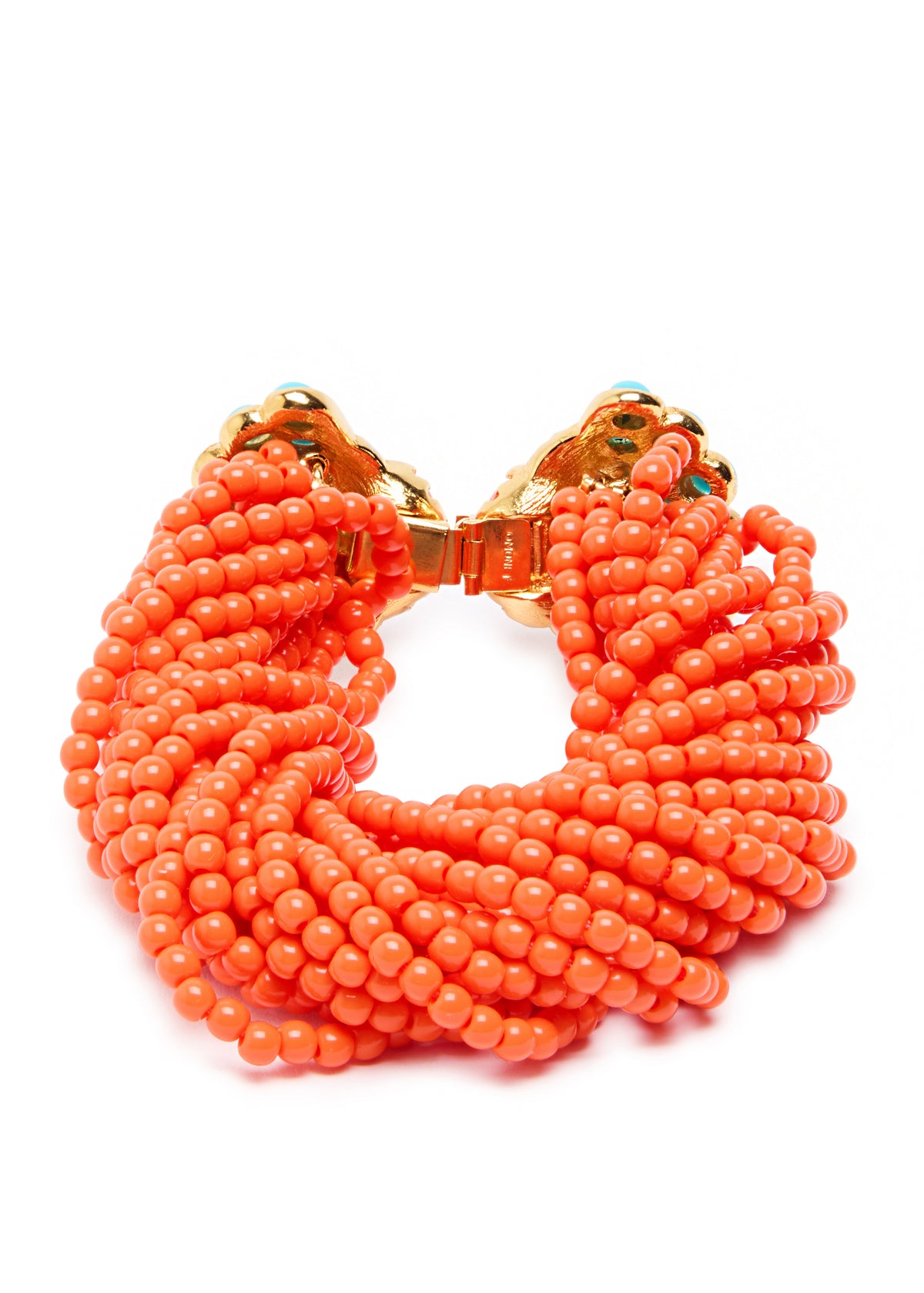 This Beaded 22kt gold-plated bracelet by Kenneth Jay Lane is a bold and luxurious statement. The multi-row, beaded design is beautifully adorned with vibrant cabochon gemstones and sparkling crystal embellishments. This bracelet is a perfect accessory for adding a touch of confident, high-fashion glamour and a vibrant pop of color.
