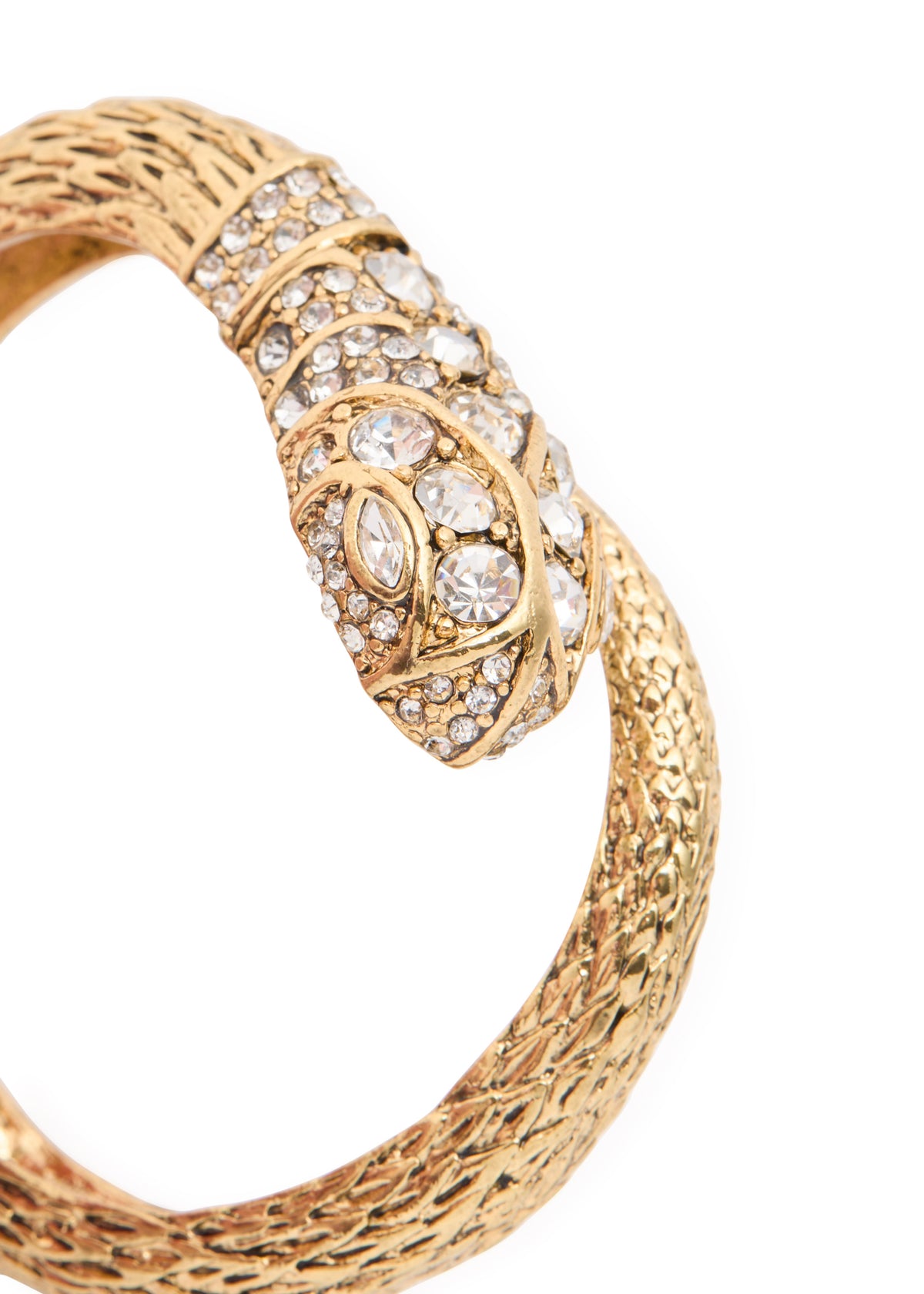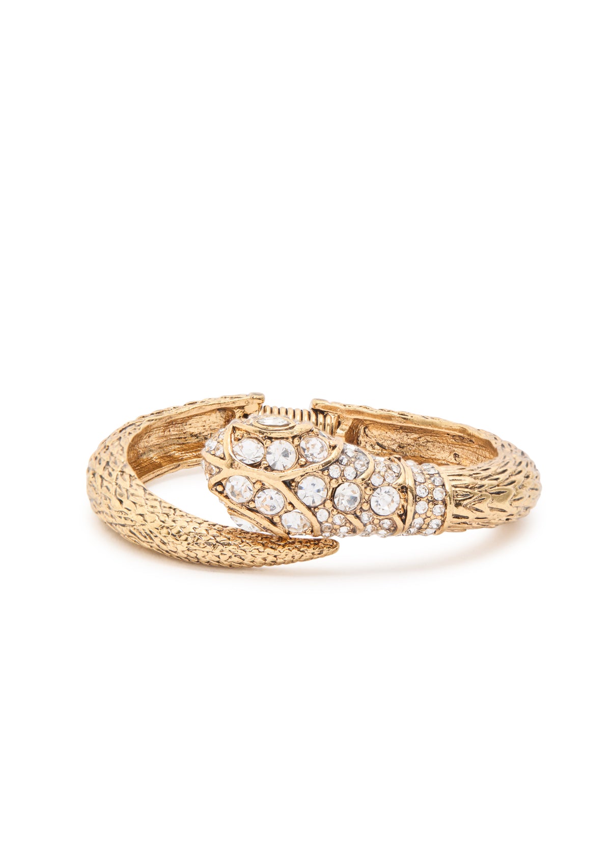 This bracelet is crafted from 22kt gold-plated brass and features a sculpted snake design with crystal embellishments. The width varies from 1cm to 3.5cm.