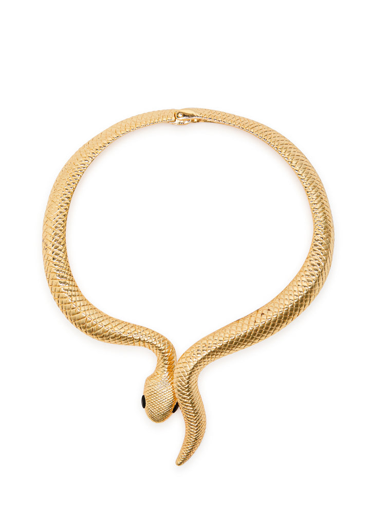This Snake 22kt gold-plated necklace by Kenneth Jay Lane is a bold and captivating statement. The sculpted snake design with its enamelled inserts and textured finish creates a sense of powerful, mystical elegance. This necklace is a perfect accessory for adding a touch of confident, high-fashion flair to your neckline.