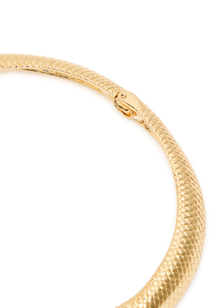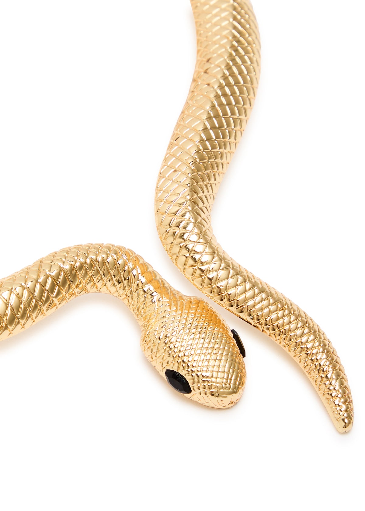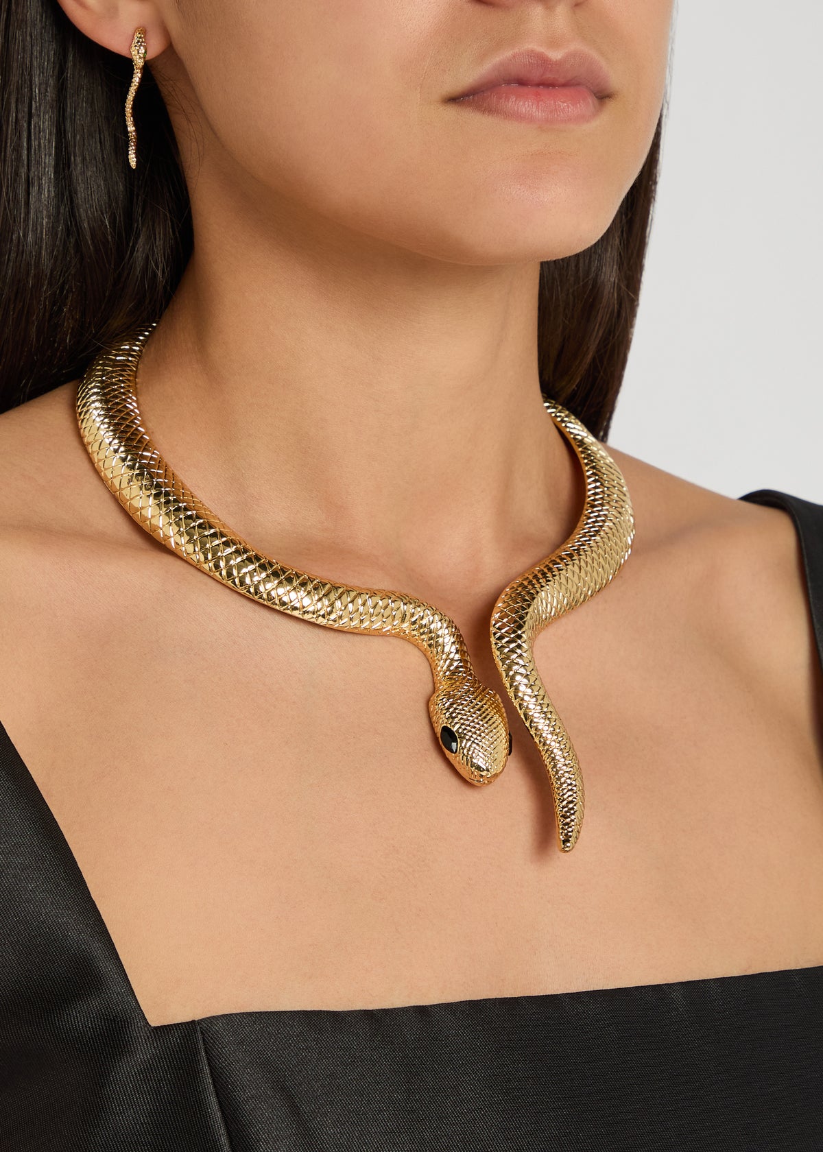 This necklace is crafted from 22kt gold-plated metal and features a sculpted snake design with enamelled inserts. It has a hinge fastening and a 19.5cm drop.