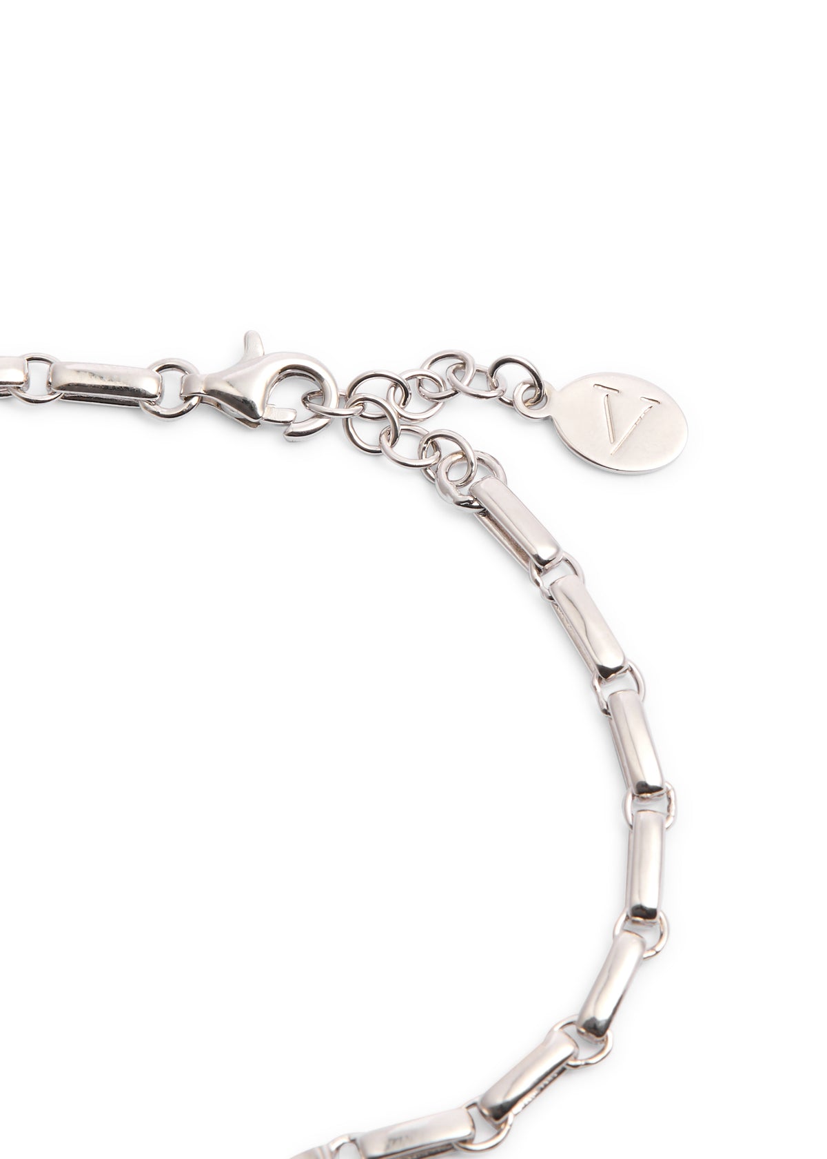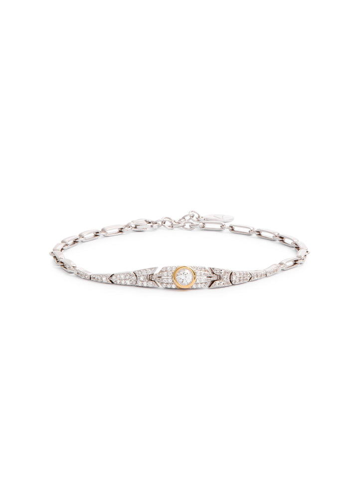 This bracelet is crafted from rhodium-plated brass with 18kt gold vermeil details and crystal embellishments. The total length is 19cm, and it is secured with an adjustable lobster-clasp fastening. It is presented in a designer-stamped box.