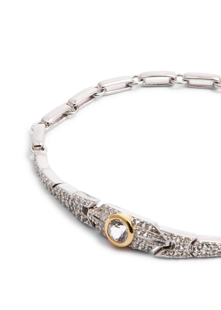 This Crystal-embellished rhodium-plated bracelet by Laura Vann is a celebration of sleek, contemporary glamour. The brilliant crystal embellishments are beautifully complemented by a bold 18kt gold vermeil detail, creating a chic, two-toned look. This piece adds a touch of modern luxury to any wrist, perfect for everyday wear or a special occasion. Its adjustable design ensures a comfortable fit for any wrist size.