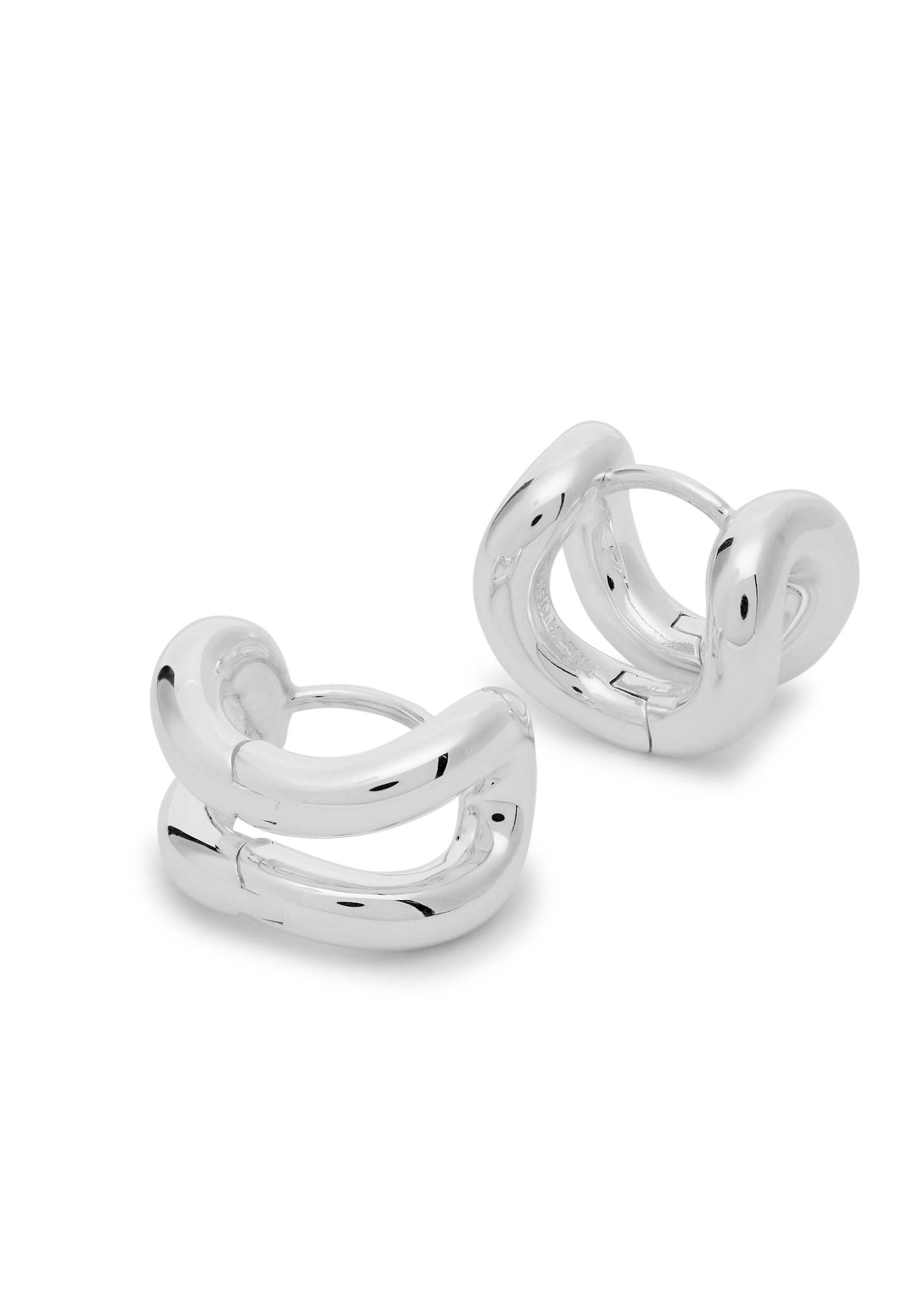 These handmade hoop earrings are crafted from sterling silver with a sculpted double-layer design. The total drop length is 1cm, and they are secured with a sleeper fastening. They are presented in a designer-stamped box.