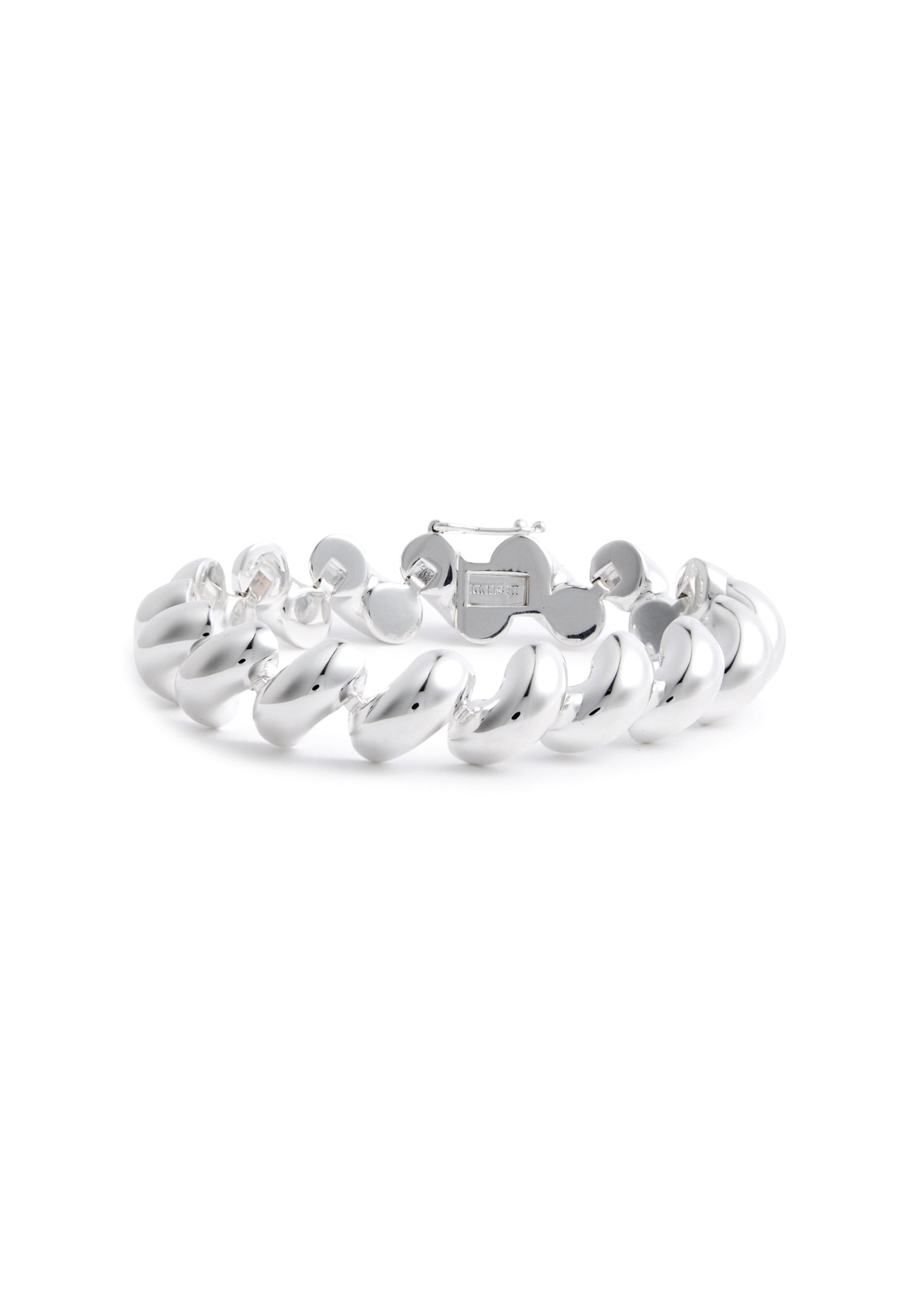 This handmade bracelet is crafted from sterling silver-plated brass with a sculpted curve link design. The length is 18.5cm, and it is secured with a push-clasp fastening. It is presented in a designer-stamped box.