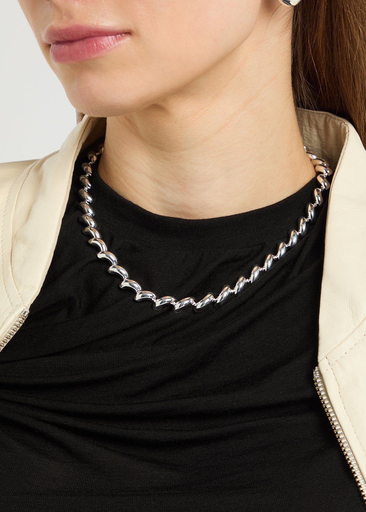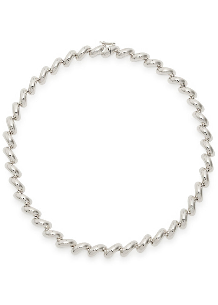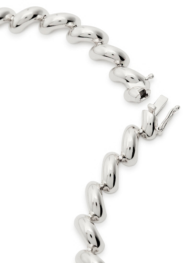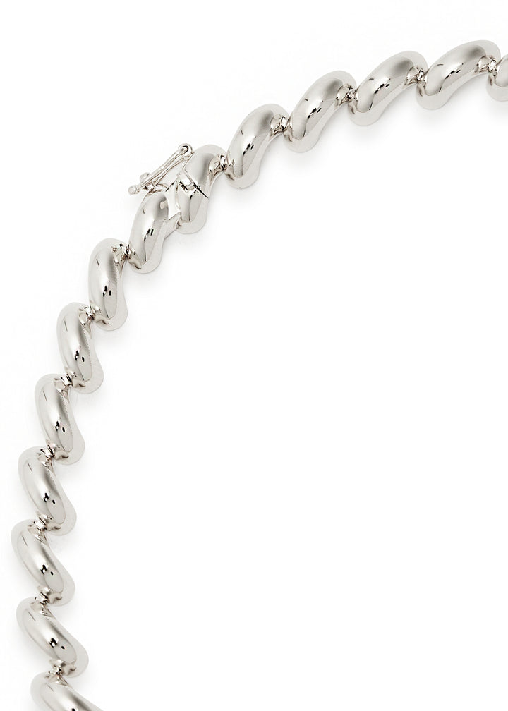 This handmade necklace is crafted from sterling silver-plated brass with a sculpted curve link design. The length is 41.5cm, and it is secured with a push-clasp fastening. It is presented in a designer-stamped box.