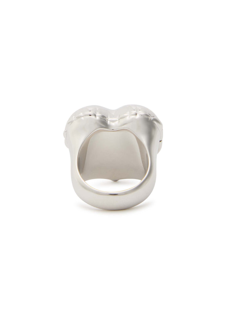 This The Heart Balloon Locket ring by Marc Jacobs is a playful and romantic piece. The sculpted heart-shaped locket face with its whimsical balloon design opens to reveal a secret, removable portrait of the designer, making it a truly personal and sentimental accessory. This ring captures a sense of modern nostalgia and personal connection, perfect for those who cherish unique and meaningful jewelry.