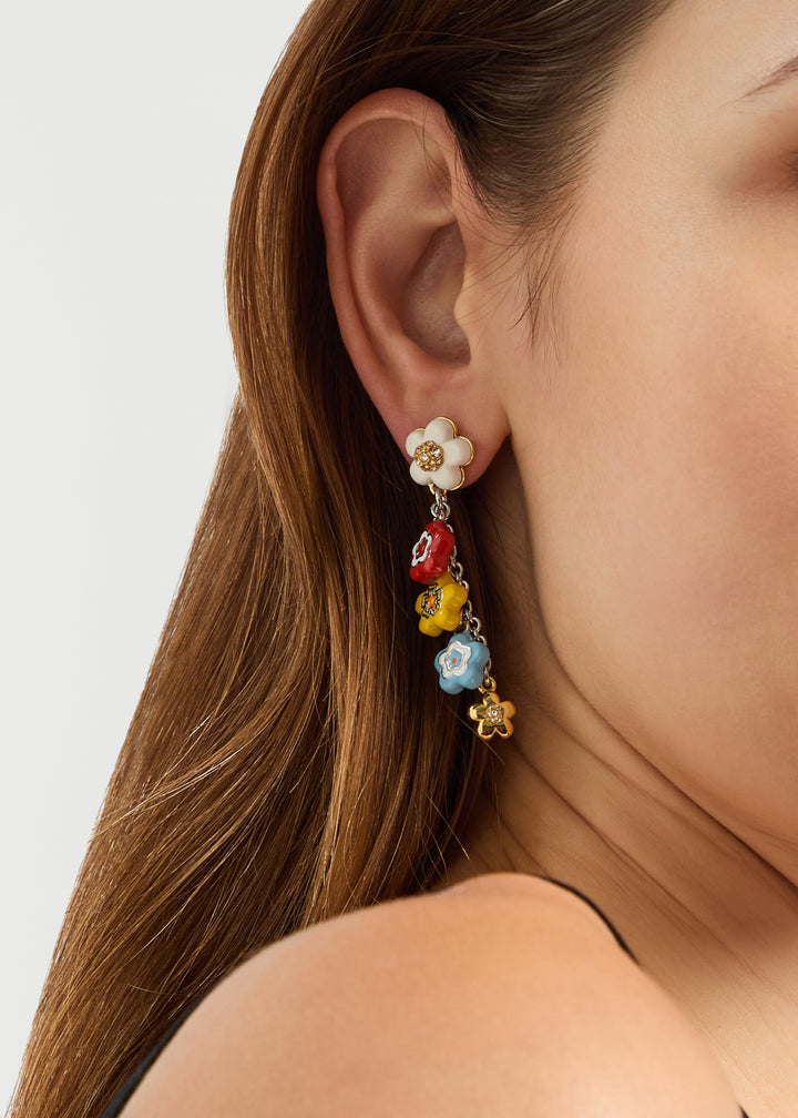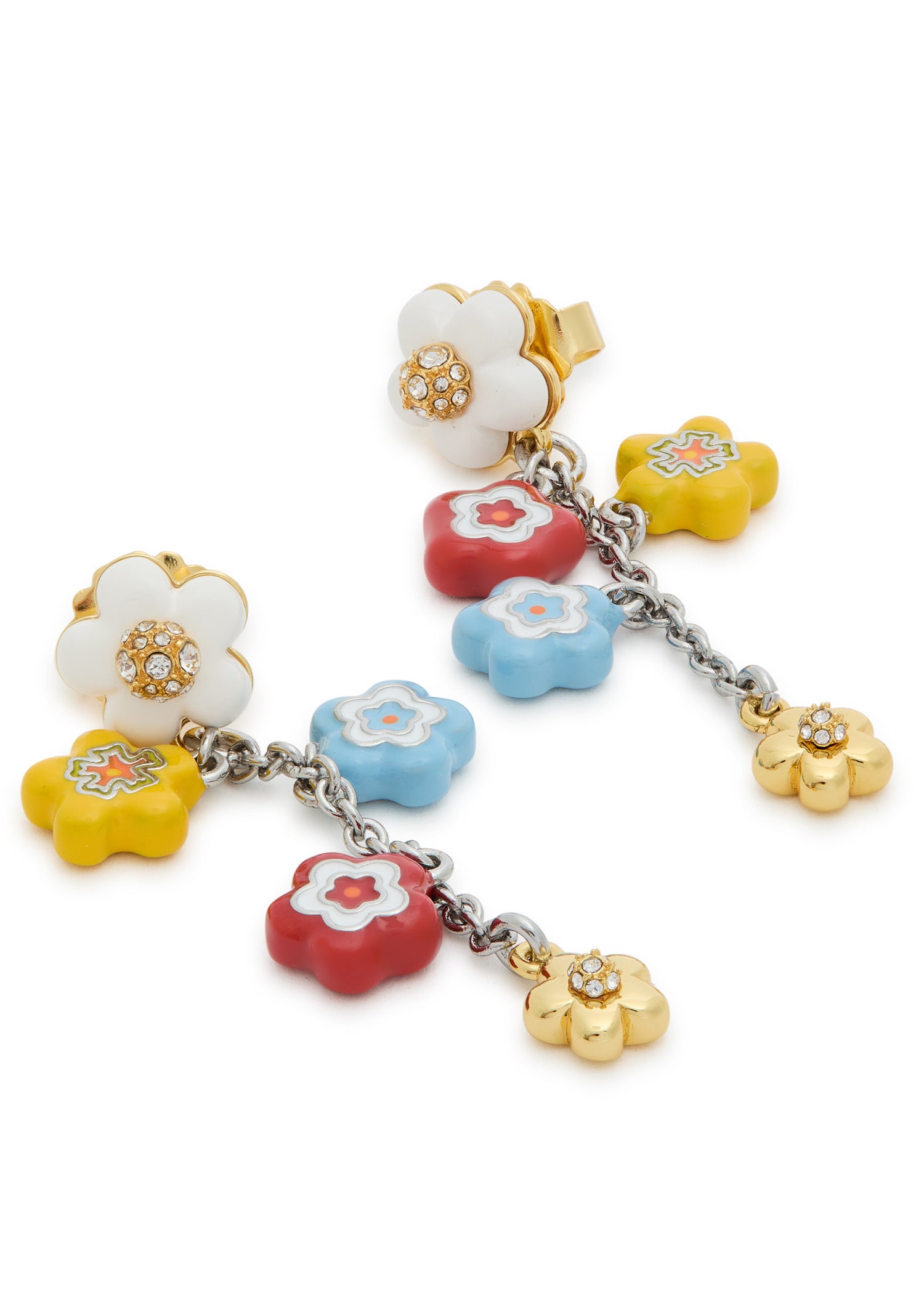 These drop earrings are crafted from a proprietary metal blend with a crystal-embellished flower chain design. The total drop length is 4.5cm, and they are secured with a butterfly-fastening. They are presented in a designer-stamped box.