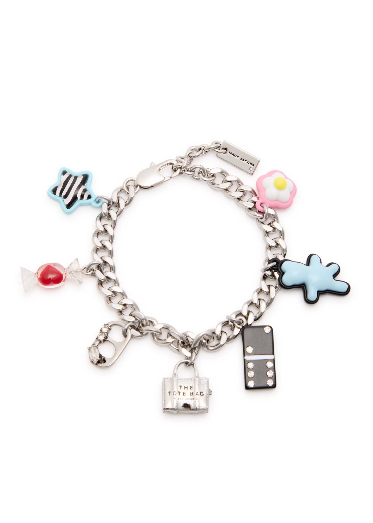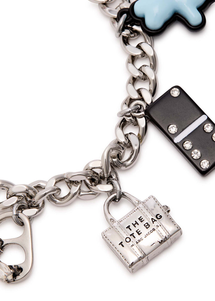 This bracelet is crafted from a proprietary metal blend with a resin insert and crystal embellishments. It features various logo and motif charms. The length is 19cm, and it is secured with an adjustable lobster-clasp fastening. It is presented in a designer-stamped box.