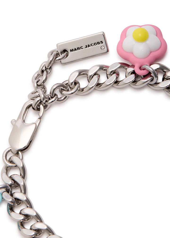 This Sticker Charm bracelet by Marc Jacobs is a playful collection of iconic motifs. The bracelet features a delightful mix of logo and motif charms, including resin inserts and sparkling crystal embellishments. This piece has a fun, whimsical vibe, perfect for those who appreciate a touch of quirky glamour. It symbolizes a love for personal storytelling through unique, collectible charms.
