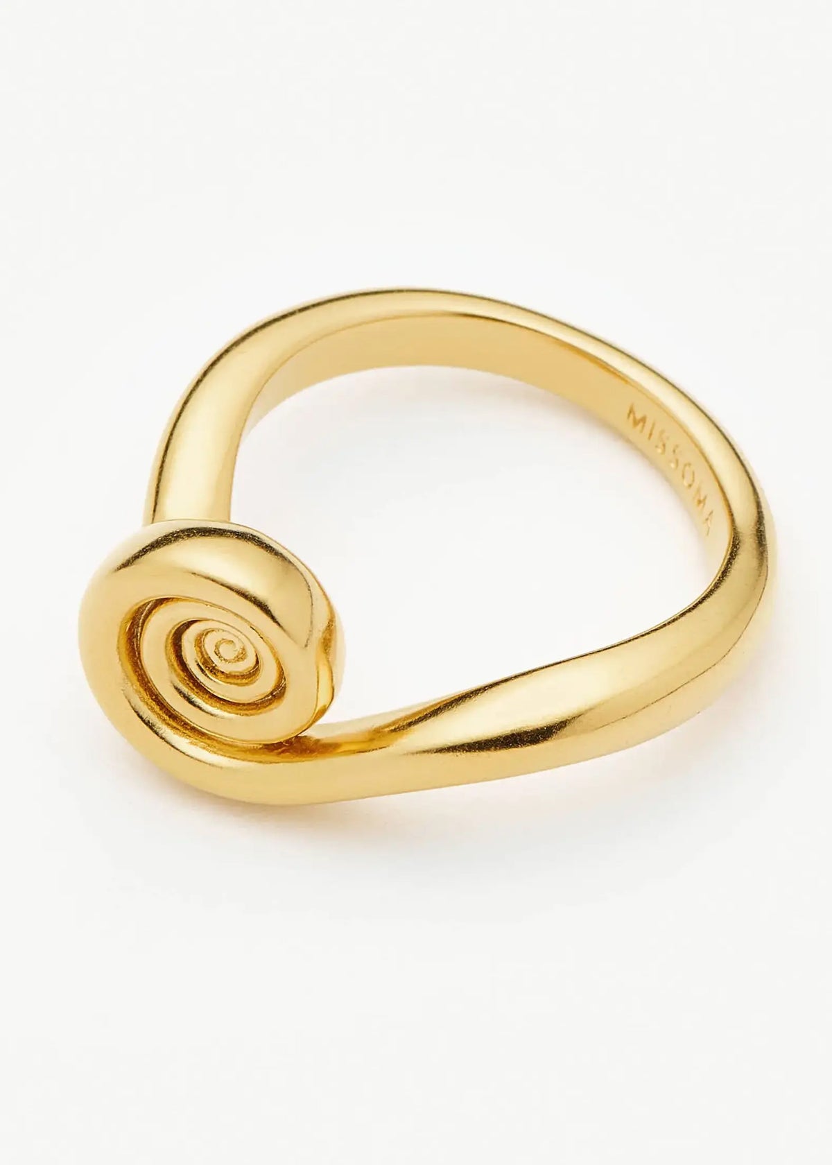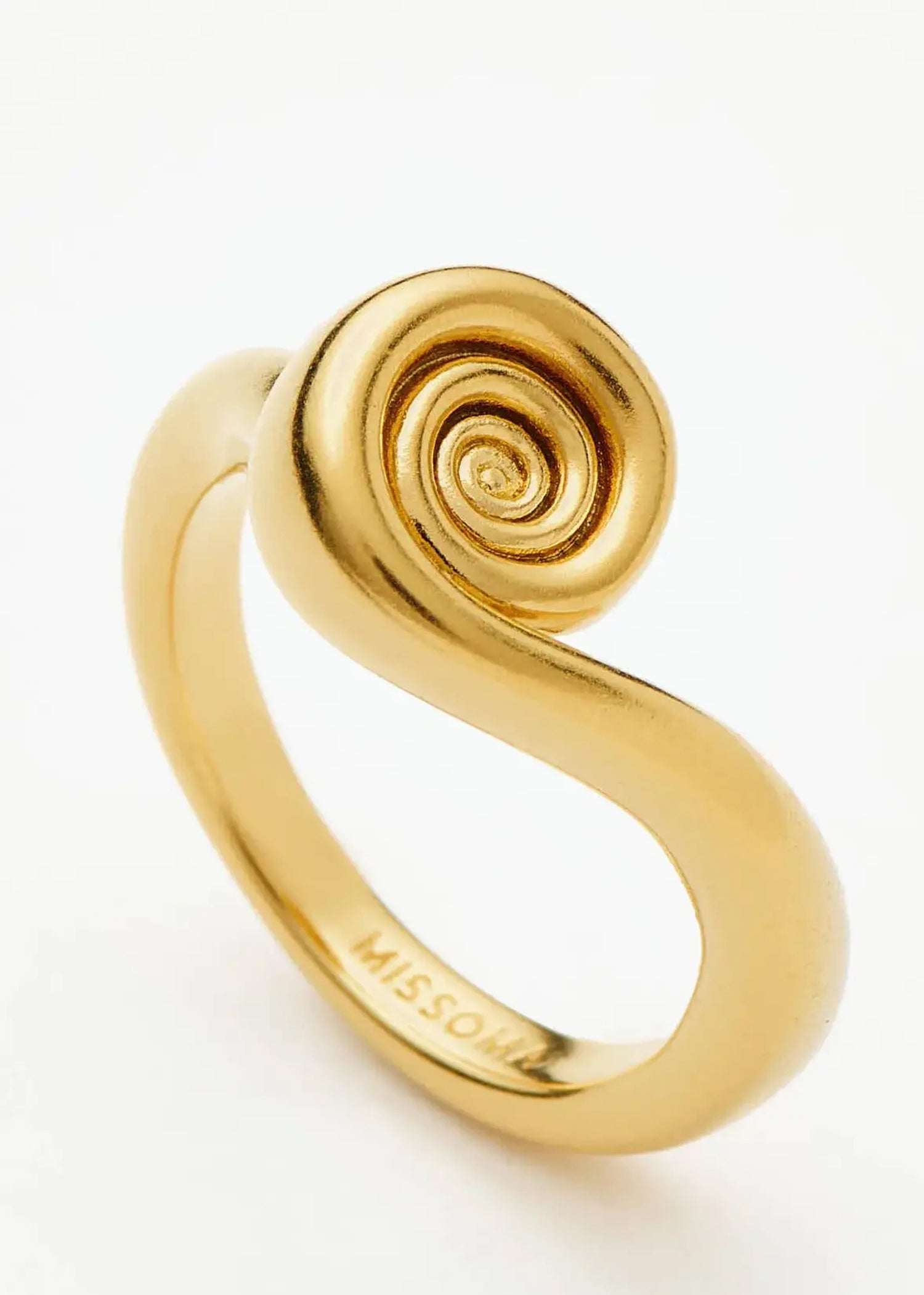 This Spiral Stacking Ring by Missoma is a beautifully crafted piece that captures a sense of fluid, modern design. The sculpted spiral design creates a continuous, elegant line on the finger, perfect for adding a touch of sophisticated texture. This versatile ring is ideal for stacking with other bands or for wearing alone as a simple statement of unique style. It symbolizes a continuous journey and refined elegance.