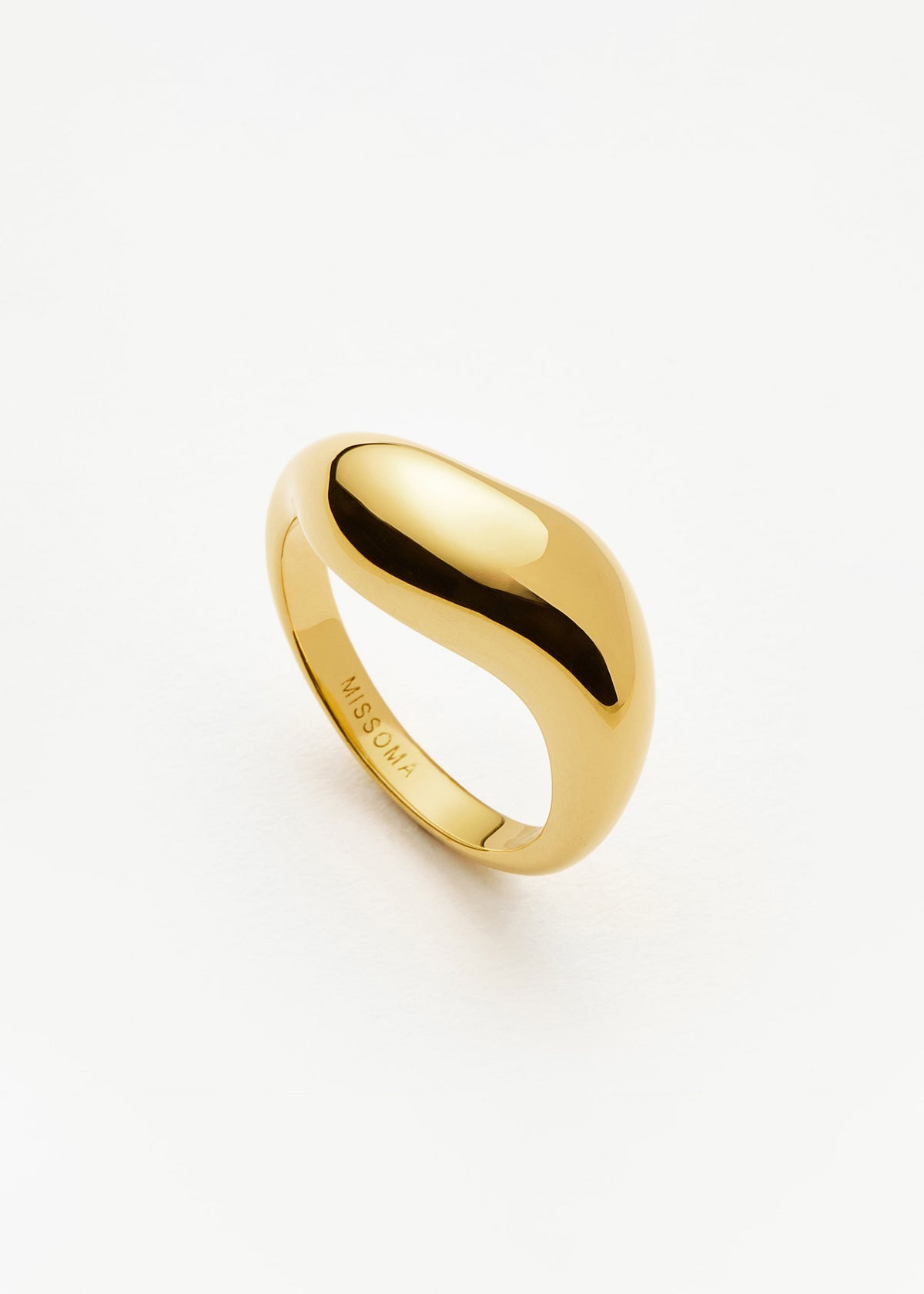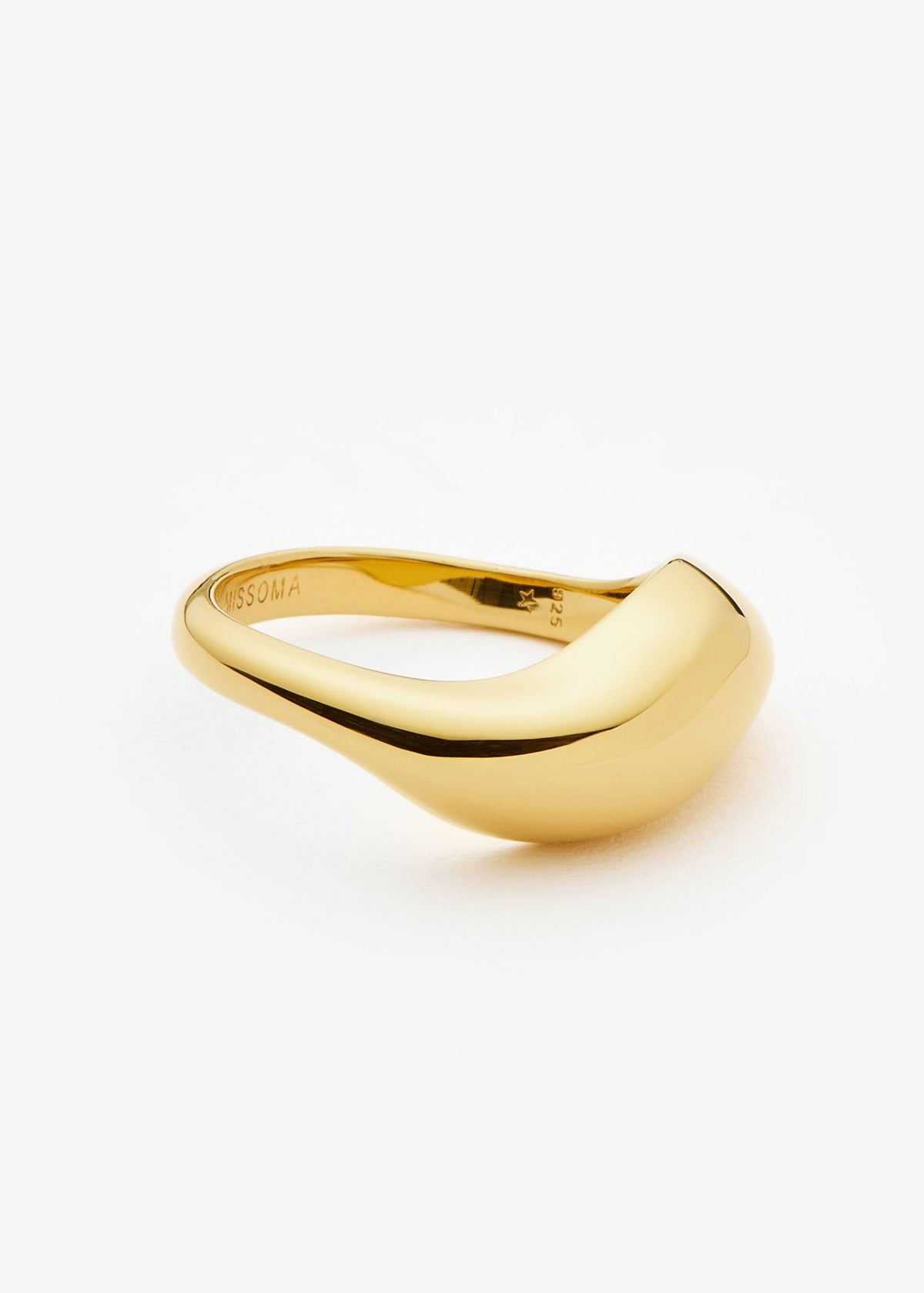 This Savi Signature 18kt gold vermeil by Missoma X SAVISLOOK is a hand-finished ring that exudes confident elegance. The sculpted, tapered band creates a sense of modern artistry and luxurious simplicity. This versatile piece is perfect for wearing alone as a statement of refined style or for adding a beautiful gold element to your ring stack. It symbolizes a timeless and sophisticated aesthetic.