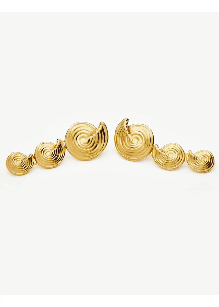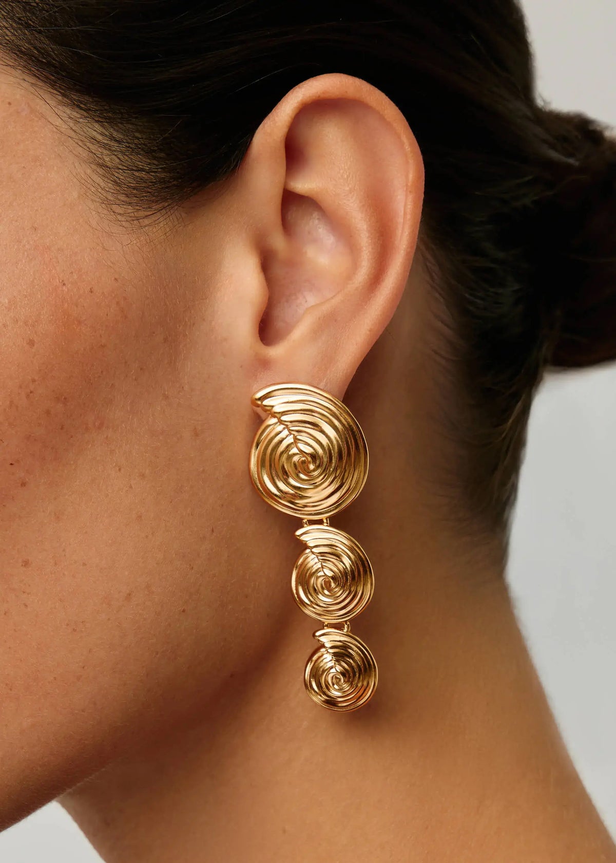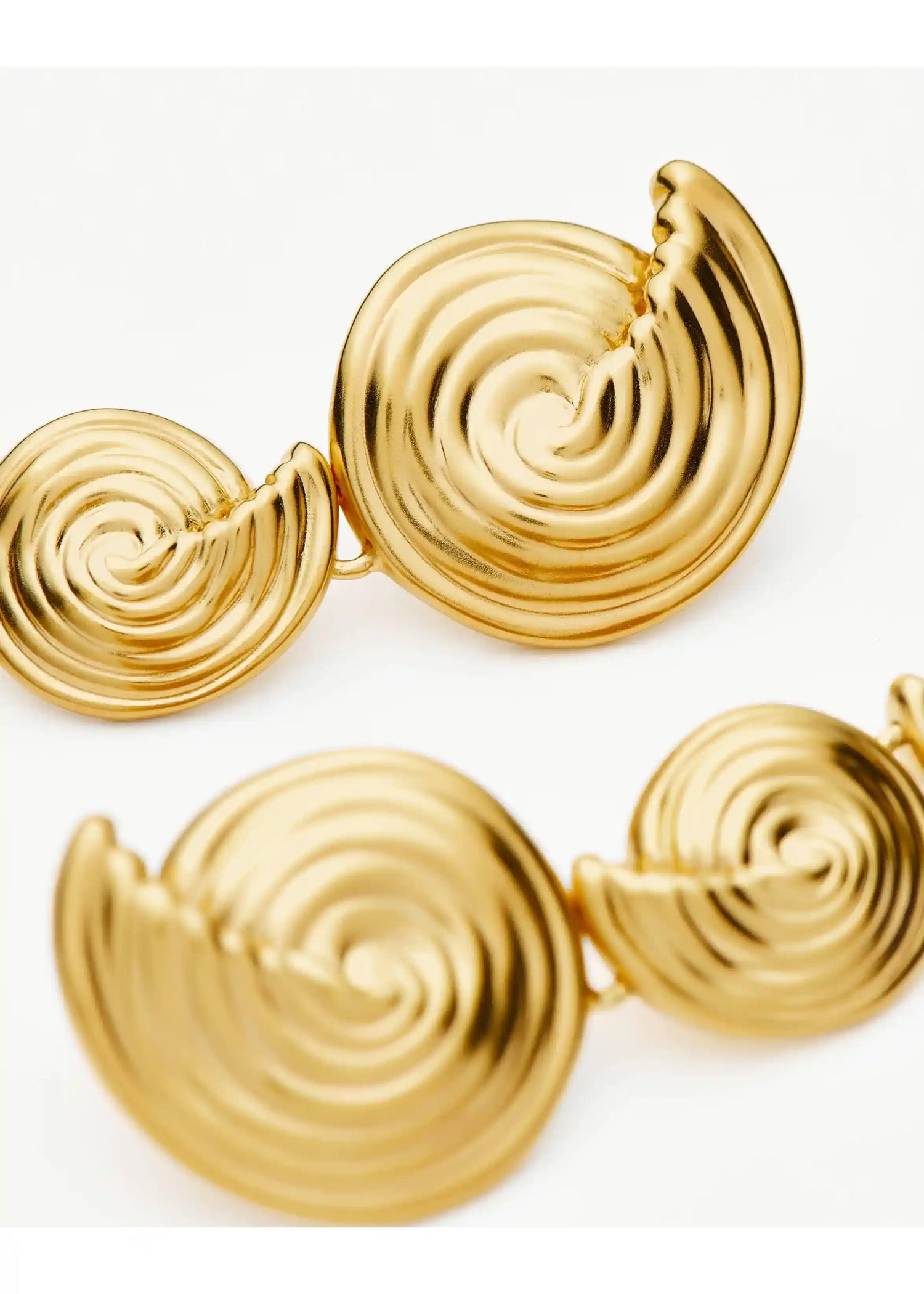 These earrings are crafted from 18ct recycled gold-plated brass with a sculpted spiral design. The total drop is 60mm, and the spirals reduce in size from 25.7mm x 22.5mm to 16mm x 13.7mm. They are secured with a butterfly fastening.