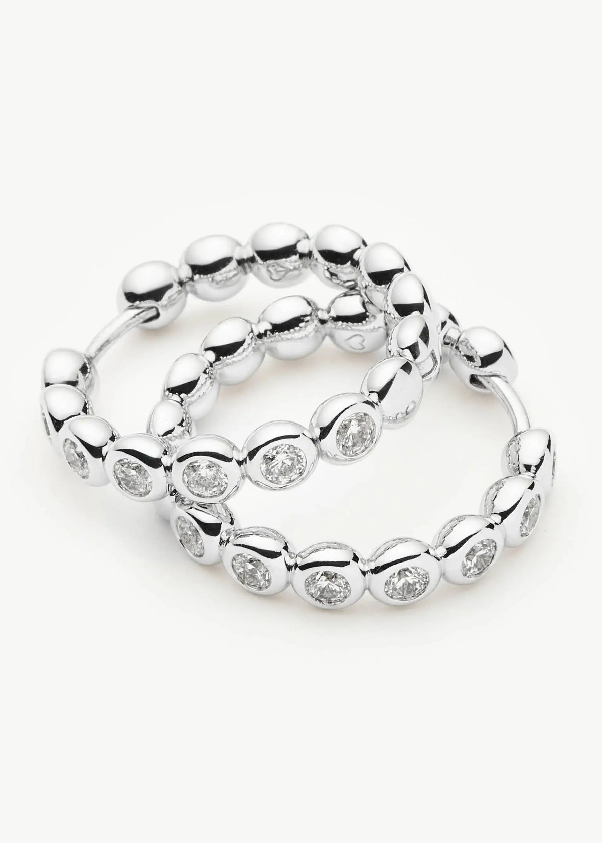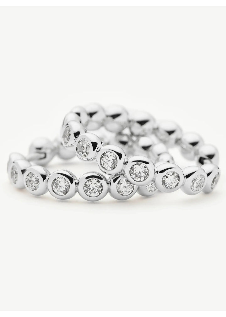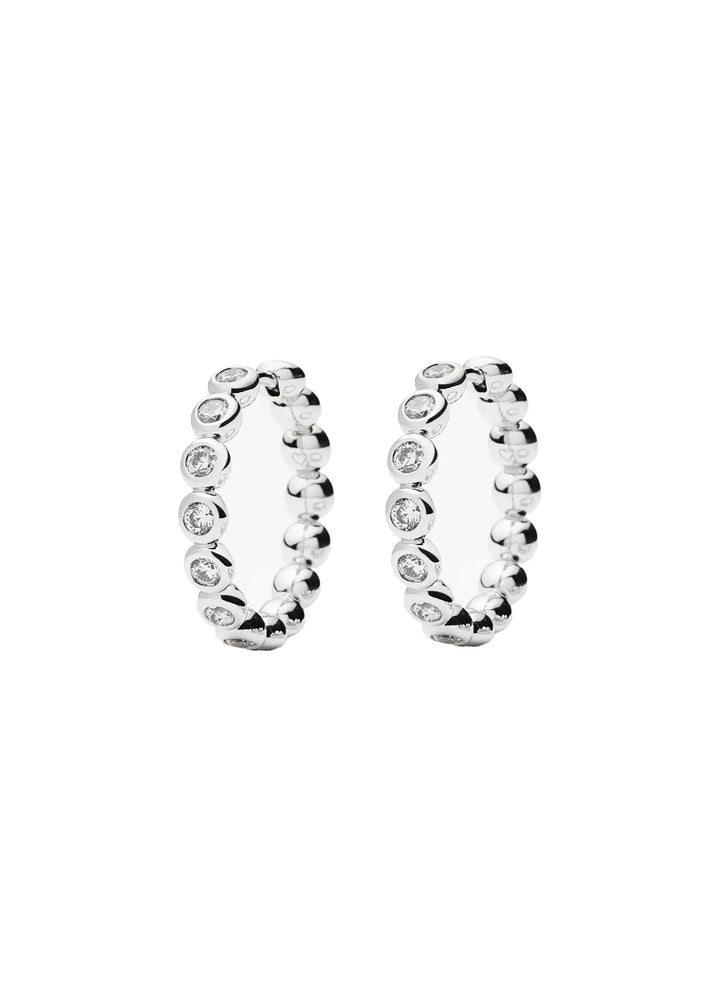 These hoops are crafted from rhodium-plated brass with cubic zirconia embellishments. The total drop is 22mm, and they are secured with a sleeper fastening.