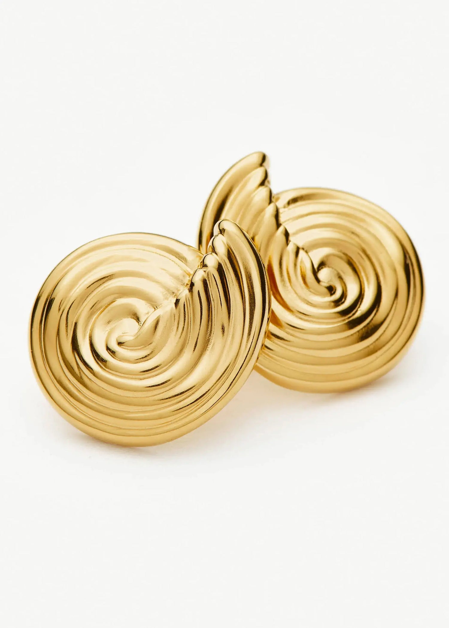 These earrings are crafted from 18ct recycled gold-plated brass with a sculpted spiral design. The dimensions are 17.2mm x 14.8mm, and they are secured with a butterfly fastening.