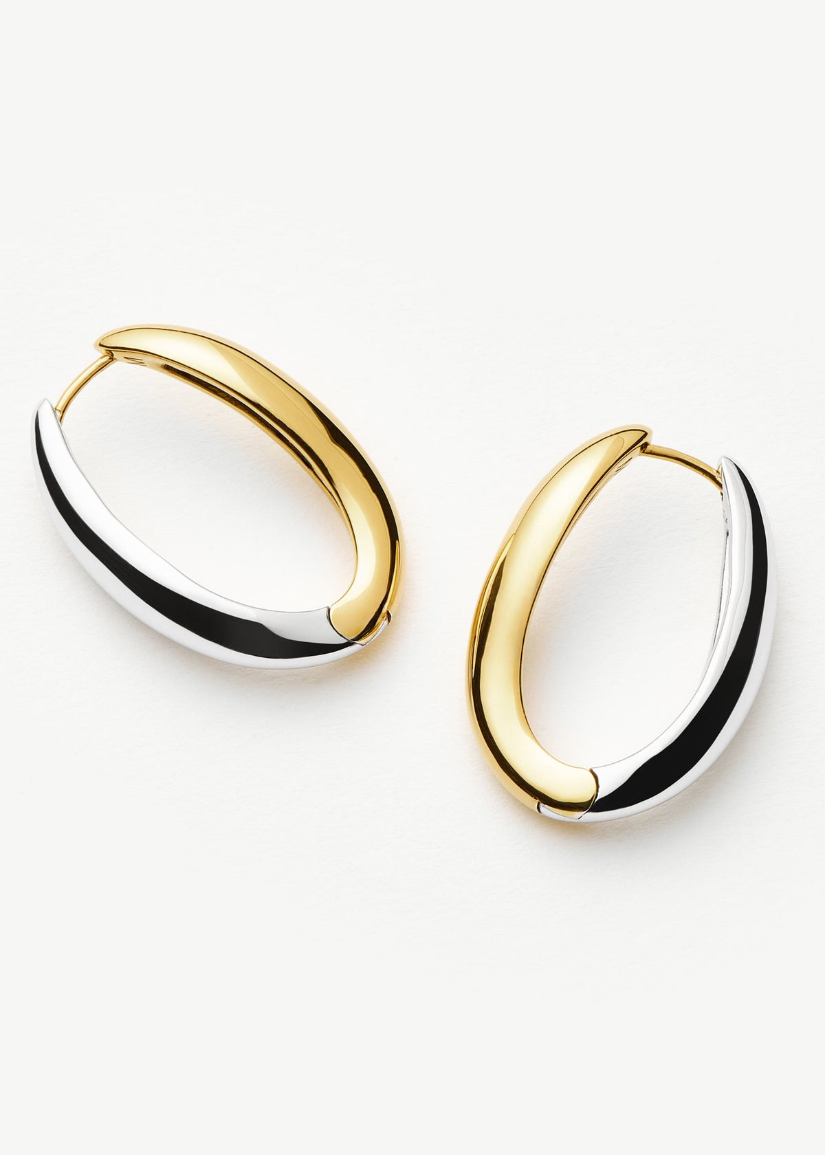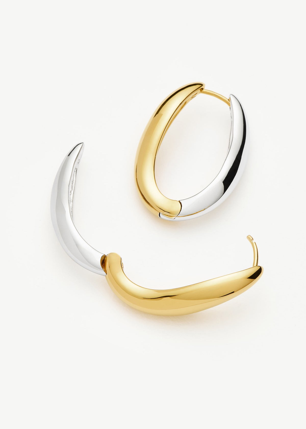 These hoops are crafted from 18ct recycled gold-plated brass and rhodium-plated brass with a curved design. The hoop width is 0.5cm, the height is 2cm, and they are secured with a post fastening.